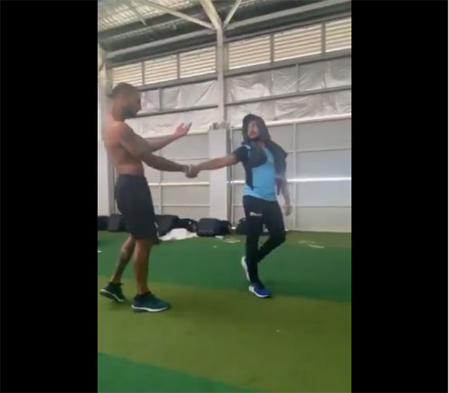 By: Tupaki Desk | 19 Nov 2020 11:30 AM ISTఇటీవలే ఐపీఎల్ను ముగించుకుని ఆస్ట్రేలియా పర్యటనకు వెళ్లిన టీం ఇండియా క్వారంటైన్ను పూర్తి చేసుకుని ప్రాక్టీస్ కు సిద్దం అయ్యింది. ఈనెల 27న మొదటి మ్యాచ్ జరుగనుంది. ప్రాక్టీస్ సందర్బంగా ఆటగాళ్లు సరదాగా ఎంజాయ్ చేస్తూ ఉంటారు. తాజాగా నెట్ ప్రాక్టీస్ గ్యాప్ లో శిఖర్ ధావన్ మరియు పృథ్వీషాలు సరదాగా ఒక హిందీ పాటకు డాన్స్ చేశారు. ఆ పాటలో లేడీగా హొయలు ఒలికిస్తూ పృథ్వీషా నడుస్తూ వెళ్తూ ఉండగా వెనుకనుండి టీజ్ చేస్తున్నట్లుగా శివఖర్ ధావన్ అనుసరించాడు. ఆ సమయంలో తన షర్ట్ తీసేసి పృథ్వీ షా చేయి పట్టుకుని రొమాంటిక్ గా వ్యవహరించాడు.
