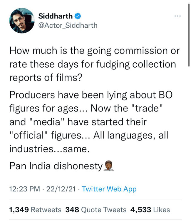 “ఈ రోజుల్లో సినిమాల కలెక్షన్ రిపోర్టులను ఫడ్జింగ్ చేయడానికి కమీషన్ లేదా రేటు ఎంత? నిర్మాతలు చాలా కాలంగా బాక్సాఫీస్ లెక్కల గురించి అబద్ధాలు చెబుతున్నారు.. ఇప్పుడు "వాణిజ్యం" మరియు "మీడియా" వారి "అధికారిక" గణాంకాలను చెప్పడం ప్రారంభించాయి.. అన్ని భాషలు, అన్ని పరిశ్రమలు ఒకేలా ఉన్నాయి. పాన్ ఇండియా మోసం” అని సిద్దార్థ్ ట్వీట్ లో పేర్కొన్నారు.