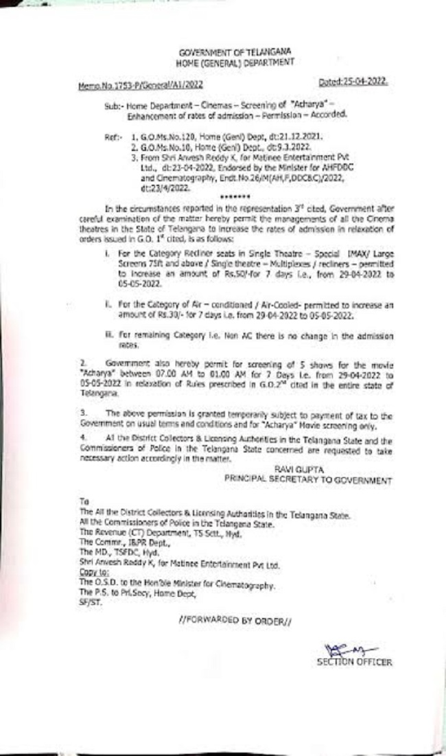 అయితే తెలంగాణ ప్రభుత్వం 'ఆచార్య' సినిమాకు తీపి కబురు చెప్పింది. టికెట్ రేట్లు పెంచుకునేందుకు అనుమతిస్తూ ఈ మేరకు జీవో కూడా విడుదల చేసింది. నిర్మాతల రిక్వెస్ట్ ను పరిగణలోకి తీసుకుని.. ఏప్రిల్ 29వ తేదీ నుంచి మే 5వ తేదీ వరకు టికెట్ రేట్లు పెంచుకోవడానికి పర్మిషన్ ఇచ్చినట్లు తెలిపారు.