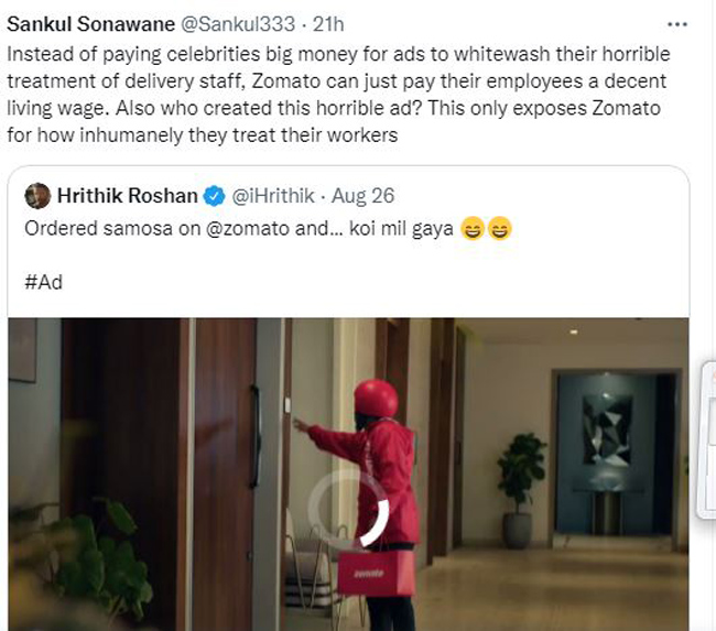 అయితే ఈ ప్రకటన కొన్ని వర్గాల ప్రజలను ఆకట్టుకోలేదు. జొమాటో ఇప్పటికే సిబ్బందితో వ్యవహరిస్తున్న తీరుపై విమర్శలను ఎదుర్కొంటోంది..ఈ ప్రకటన ద్వారా అవి మరింత ఎక్కువయ్యాయి. కంపెనీ యాడ్ పై పలువురు నెటిజన్లు విమర్శలు గుప్పిస్తున్నారు.