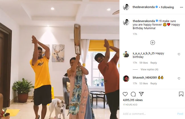 అమ్మ మాధవి బ్యాట్ పట్టుకుని ఉండగా ఆమెకు ఇరు వైపుల దేవరకొండ బ్రదర్స్ నిల్చున్నారు. ముగ్గరు కలిసి బ్యాటింగ్ చేసినట్లుగా ఫోజ్ ఇచ్చిన సరదా వీడియోను విజయ్ దేరకొండ షేర్ చేశారు. ఆ వీడియోకు నేను నిన్ను జీవితాంతం సంతోషంగా ఉంచుతానమ్మ. హ్యాపీ బర్త్ డే అమ్మ అంటూ విజయ్ కామెంట్ పెట్టాడు. విజయ్ కి అమ్మ మీద ఉన్న ప్రేమకు ఈ పోస్ట్ సాక్ష్యంగా నిలుస్తుంది అనడంలో ఎలాంటి సందేహం లేదు. ఒక మద్య తరగతి కుటుంబంకు చెందిన విజయ్ దేవరకొండ చిన్న తనంలో తన తల్లిదండ్రులు పడ్డ ఇబ్బందులను చూశారు. అందుకే ఆయన ఇప్పుడు వారిని ఎలాంటి కష్టం లేకుండా చూసుకోవాలని జీవితాంతం సంతోషంగా ఉండాలని బలంగా కోరుకుంటున్నాడు.