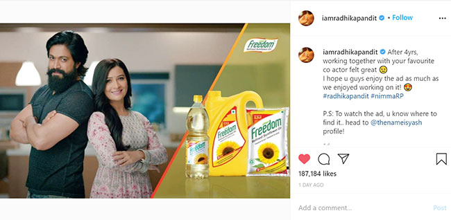 ఇటీవల ఓ ఆయిల్ బ్రాండ్ కోసం చిత్రీకరించిన యాడ్ ఫిల్మ్ లో ఈ స్టార్ కపుల్ కలిసి నటించారు. ఈ విషయాన్ని సోషల్ మీడియాలో అభిమానులతో పంచుకున్నారు రాధికా పండిట్. ఈ యాడ్ షూట్ కు సంబంధించిన ఓ ఫొటోను ఇన్స్టాగ్రామ్లో షేర్ చేసిన రాధికా.. “4 సంవత్సరాల తరువాత, మీకు ఇష్టమైన సహ నటుడితో పనిచేయడం చాలా గొప్పగా అనిపించింది. ఈ షూట్ ను మేము ఎంత ఆనందించామో.. మీరు కూడా అంతగా ఆనందిస్తారు’’ అని కోట్ చేసింది. ఈ ఫొటో ఇప్పుడు వైరల్ గా మారింది.