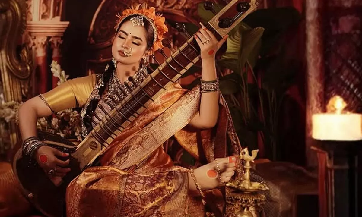 ఇక ఇక్కడ స్పెషల్ గా మాట్లాడుకోవాల్సింది గోల్డ్ ఆర్నమెంట్స్ గురించి. ఆమె ముఖంపై ఉన్న నాథ్, ఆమె మెడపై పేర్చబడిన చోకర్లు, ఆమె చేతులకు గాజులు చూస్తుంటే.. ఆమె ఒక అపురూప చిత్రం నుండి బయటకు అడుగుపెట్టినట్లు కనిపిస్తున్నాయి. బంతి పువ్వులా మెరిసే పువ్వులు ఆమె జడకు కిరీటంగా అలంకరించినట్లు ఉండగా... ఆమె తలపై రాళ్లు, రత్నాలు ఫేస్ లుక్ ను మరింత ఆకర్షించాయి. ఆమె చేతుల్లోని వీణ కూడా దానికి స్వయంగా ఆమెు చెందినదిగానే అనిపిస్తుంది.