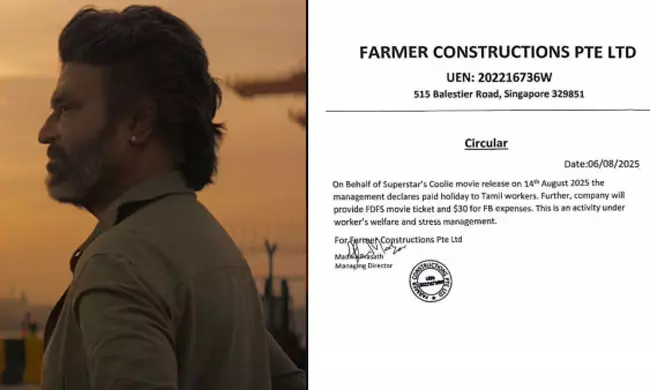 ఎంచక్కా సినిమా ఎంజాయ్ చేసి మరుసటి రోజు ఆపీస్ కు రా బాబు అని నోటీస్ బోర్టులో ఆదేశిలిచ్చే బాస్ ఆ ఒక్కడే. ఆగస్టు 14న సూపర్ స్టార్ రజనీకాంత్ నటిస్తోన్న `కూలీ` రిలీజ్ అవుతున్న సందర్భంగా ఓ కంపెనీ ఉద్యోగులకు ఇలాంటి అవకాశం కల్పించింది. అంతే కాదు రజనీకాంత్ 50 ఏళ్ల కెరీర్ ను పూర్తి చేసుకున్న సందర్భంగా అనాదశ్రమాల్లో అన్నదాన కార్యక్రమం కూడా చేపడుతున్నారు. ప్రస్తుతం ఈ వార్త సోషల్ మీడియాలో వైరల్ గా మారింది.