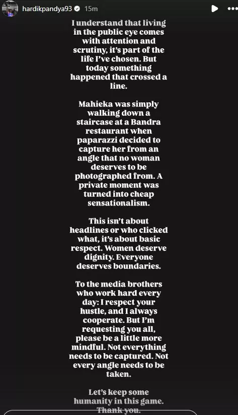 ప్రతిరోజు కష్టపడి పని చేసే మీడియా సోదరులను నేను గౌరవిస్తాను. వారికి ఎల్లప్పుడూ సహకరిస్తాను.కానీ నేను మీ అందరి నుండి అభ్యర్థించేది ఒకే ఒక్కటి. దయచేసి కొంచెం జాగ్రత్తగా ఉండండి.ప్రతి దానిని ఫోటో తీయాల్సిన అవసరం లేదు. ప్రతి ఒక్క యాంగిల్ లో ఫోటో తీసుకోవాల్సిన అవసరం లేదు.ఈ విషయంలో కొంత మానవత్వాన్ని కలిగి ఉండాలని చెబుతున్నాను. ఛీప్ సెన్సేషనలిజం కోసం ఇలా దిగజారడం సరికాదు. మహిళలను గౌరవించాలి. ఫోటోలు తీసేటప్పుడు మైండ్ ఫుల్ గా ప్రవర్తించాలి. ధన్యవాదాలు" అంటూ తన పోస్టులో పెట్టారు. అయితే మహికా శర్మ ఫోటోలు అసభ్యంగా తీయడం వల్లే హార్దిక్ పాండ్యా ఈ విధంగా మీడియా మిత్రులపై ఫైర్ అయినట్టు తెలుస్తోంది.