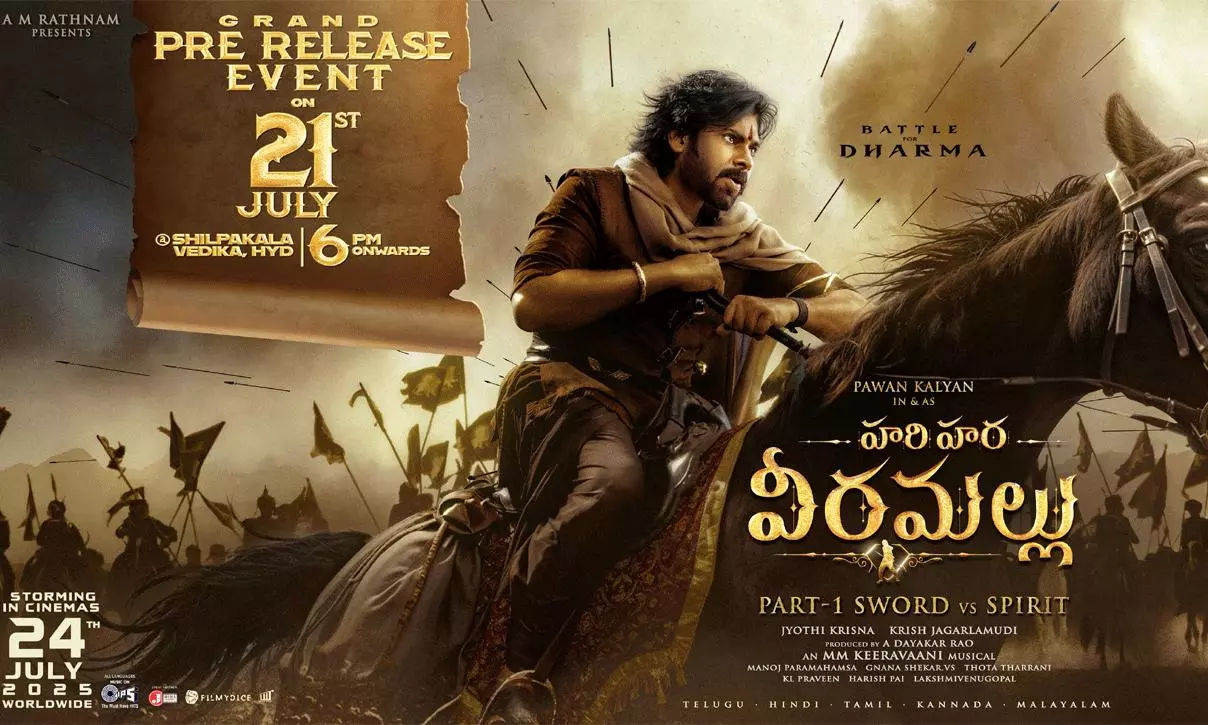 అనేక కారణాల వల్ల ఐదేళ్ల పాటు సెట్స్ పై ఉన్న హరిహర వీరమల్లు మూవీ.. ఇప్పుడు జులై 24వ తేదీన వరల్డ్ వైడ్ గా ప్రేక్షకుల ముందుకు రానుంది. ఈ నేపథ్యంలో మేకర్స్ ప్రమోషన్స్ తో బిజీగా ఉన్నారు. సినిమాకు సంబంధించిన అప్డేట్స్ ను రిలీజ్ చేస్తున్నారు. వరుస అప్డేట్స్ తో సినిమాపై బజ్ క్రియేట్ చేస్తున్నారు.