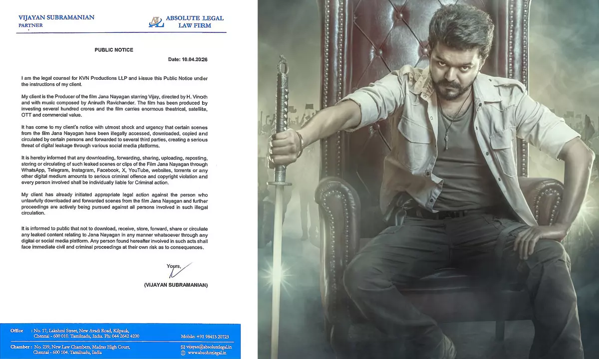 జన నాయగన్ చిత్రాన్ని నిర్మిస్తున్న కేవీఎన్ ప్రొడక్షన్స్ తరఫున న్యాయవాది విజయన్ సుబ్రమణియన్ అధికారిక లీగల్ నోటీసు విడుదల చేశారు. ఆ నోటీసులో సినిమాకు చెందిన సన్నివేశాలను కొందరు చట్టవిరుద్ధంగా యాక్సెస్ చేసి డౌన్లోడ్ చేసి సోషల్ మీడియాలో షేర్ చేస్తున్నారని పేర్కొన్నారు. ఇది సినిమా కమర్షియల్ సక్సెస్ పై తీవ్ర ప్రభావం చూపే ప్రమాదం ఉందని ఆందోళన వ్యక్తం చేశారు.