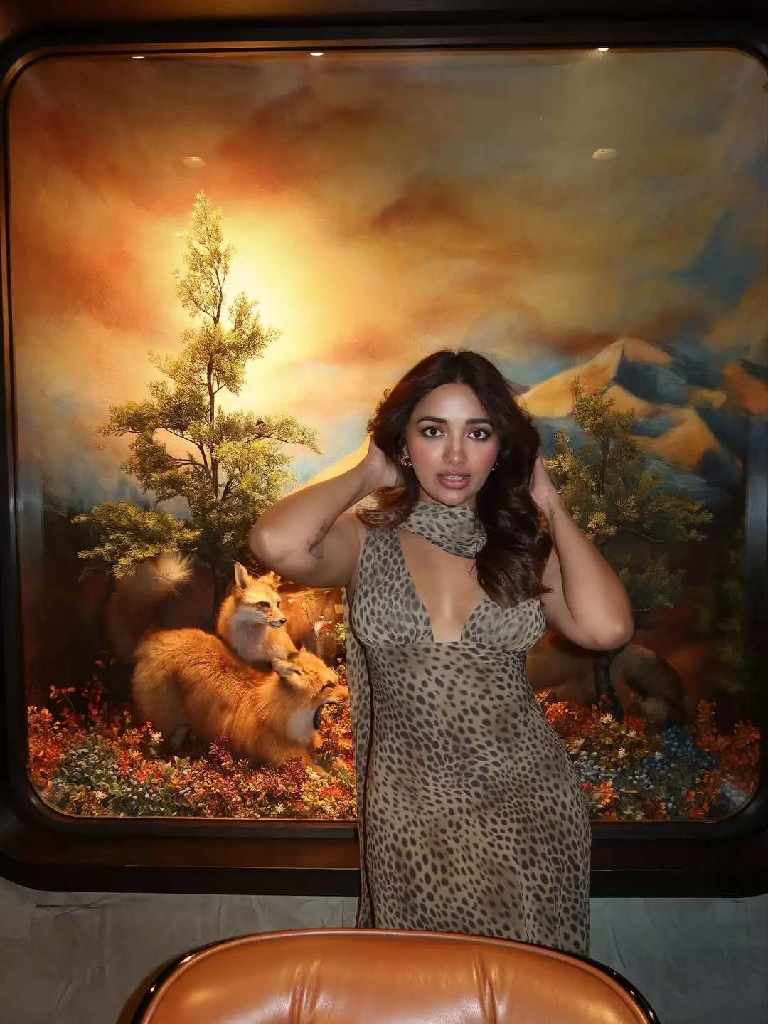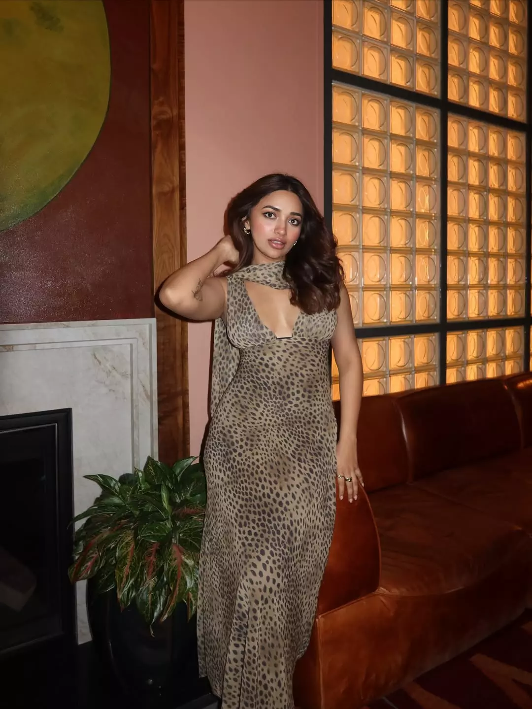 Jiya Shankar recently shared a new set of photos on the Instagram and the post immediately caught attention. In the picture, she stands beside a warm-toned wall with soft lighting behind her. She is wearing a long, fitted dress with a leopard-style pattern.