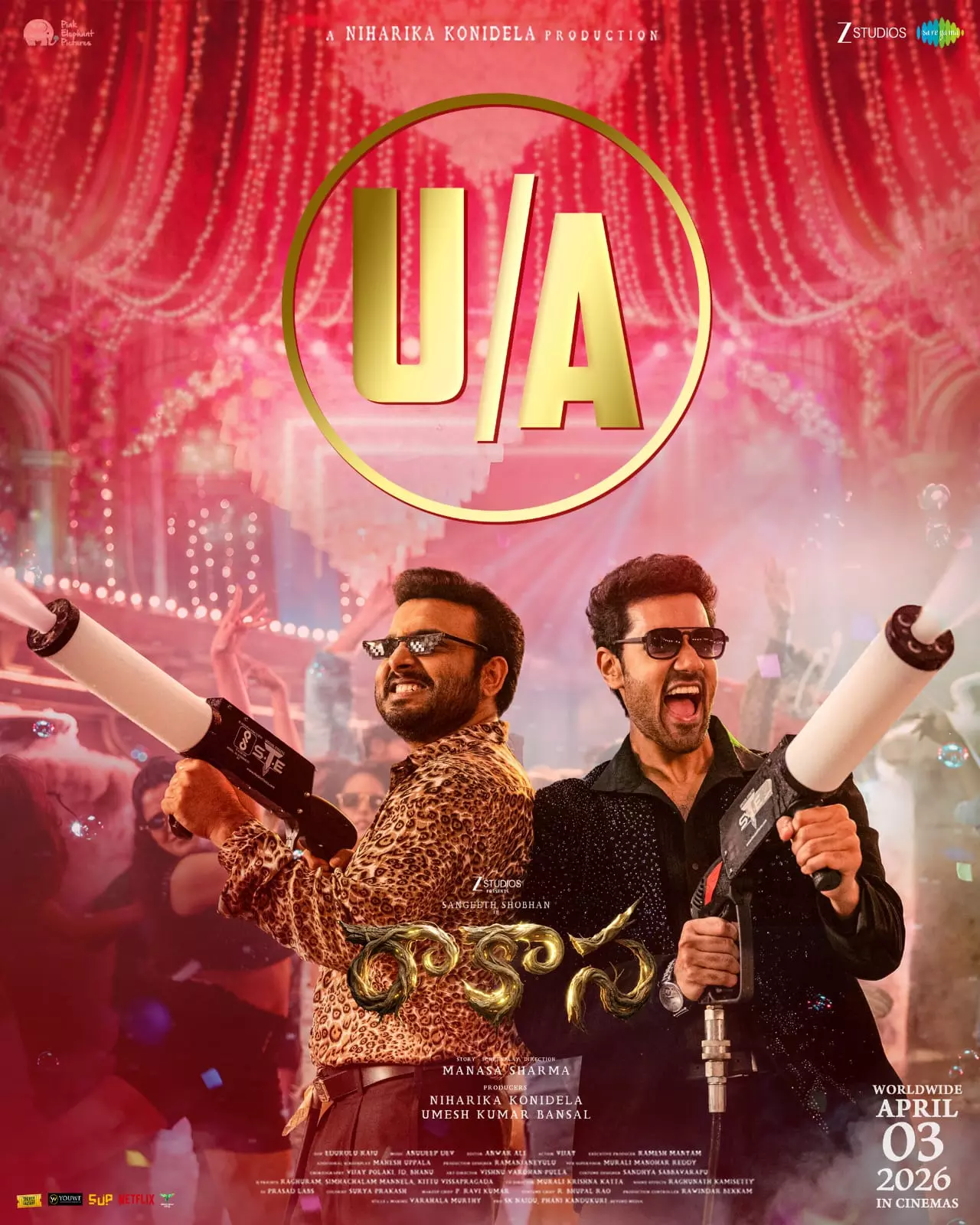 By: Madhu Reddy | 26 March 2026 10:30 PM ISTమెగా ప్రిన్సెస్ నిహారిక కొణిదెల నిర్మాణంలో వస్తున్న క్రేజీ హారర్ కామెడీ థ్రిల్లర్ 'రాకాస' విడుదలకు సిద్ధమైంది. 'మ్యాడ్' ఫేమ్ సంగీత్ శోభన్ హీరోగా నటిస్తున్న ఈ సినిమా తాజాగా సెన్సార్ కార్యక్రమాలను పూర్తి చేసుకుని U/A సర్టిఫికేట్ను దక్కించుకుంది. విభిన్నమైన కథాంశంతో, భయం కలిగిస్తూనే కడుపుబ్బ నవ్వించేలా రూపొందిన ఈ చిత్రంపై ట్రేడ్ వర్గాల్లో భారీ అంచనాలు ఉన్నాయి. ఏప్రిల్ 3న థియేటర్లలో సందడి చేయనున్న ఈ సినిమా, వేసవి కానుకగా ప్రేక్షకులకు ఫుల్ ఎంటర్టైన్మెంట్ అందించడం ఖాయంగా కనిపిస్తోంది.