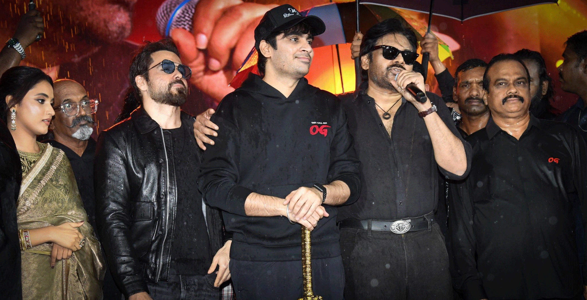 ఈ సినిమాకి ఇద్దరే స్టార్స్ .. పవన్ కల్యాణ్ కాదు.. సినిమాకి ఏది బాగా రావాలన్నా దర్శకుడు -రచయిత ముఖ్యం. ఆ క్రెడిట్ సుజీత్ కే చెందుతుంది. ఇది బాగా రావాలంటే థమన్ సాయం అవసరం. వీళ్లంతా ఒక ప్రయాణంలో ఉంటే అందులోకి నన్ను కూడా లాగారు`` అని పవన్ చెప్పుకొచ్చారు. అయితే ఓజీ ట్రైలర్ రాక కోసం ఎంతో ఉత్కంఠగా వేచి చూసిన అభిమానులు ట్రైలర్ రాక ఆలస్యం కావడంతో చాలా కోపోద్రిక్తులయ్యారు. వేదిక వద్ద కేకలు అరుపులతో హోరెత్తిపోయింది. ఇక ఓజీ ప్రమోషన్స్ కోసం డిజైన్ చేసిన వేదిక అత్యంత భారీతనంతో అందరి దృష్టిని ఆకర్షించింది. ఓజీ కాన్సెప్టుతో బ్లాక్ డ్రెస్సుల్లో ఓజీ టీమ్ ఈ వేదికకు హాజరుకావడం, గొడుగులు పట్టుకుని వర్షంలో తడుస్తూ ఈ స్పీచ్ లు ఇవ్వడం ప్రతిదీ సినిమాటిగ్గా ఉన్నా, ఇది అభిమానులను ప్రత్యేకంగా అలరించింది.