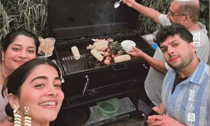 సినిమాలతో సంబంధం లేకుండా సోషల్ మీడియాలో రెగ్యులర్గా తన అందమైన ఫోటోలను షేర్ చేయడం ద్వారా అందరి దృష్టిని ఆకర్షిస్తూ ఉండే పూజా హెగ్డే తాజాగా తన ఫ్యామిలీ పిక్ను షేర్ చేసింది. సన్నిహితులతో కలిసి వెజ్ బార్బెక్యూ ట్రీట్ను ఎంజాయ్ చేసింది. చెఫ్ ప్రహ్లాద్ హెగ్డేతో కలిసి అంటూ ఈ ఫోటోను షేర్ చేసింది. ఫోటోలో పూజా హెగ్డే చాలా ఉల్లాస భరితంగా, ఉత్సాహంగా కనిపిస్తుంది. సన్నిహితులతో పూజా హెగ్డే ఉన్న ఈ ఫోటో ప్రస్తుతం సోషల్ మీడియాను షేక్ చేస్తుంది. ఈ అందాల బ్యూటీ బార్బెక్యూ ట్రీట్ ఫోటో అందరి దృష్టిని ఆకర్షించడం తో పాటు, ఫోటోలో ఉన్నది ఎవరు అంటూ చర్చకు తెర తీసింది.