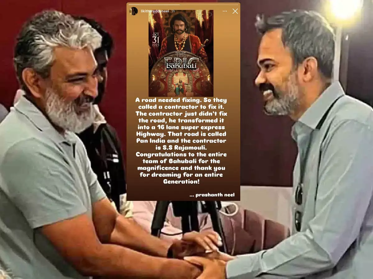 బాహుబలి ది ఎపిక్ రిలీజ్ సందర్భంగా ఎంతో మంది స్టార్స్, సెలబ్రిటీలు, దర్శకనిర్మాతలు సోషల్ మీడియా ద్వారా తమ శుభాకాంక్షలు తెలియజేయడం జరిగింది. ప్రశాంత్ నీల్ భార్య లిఖిత రెడ్డి ఇన్స్టాగ్రామ్లో షేర్ చేసిన ఒక పోస్ట్ అందరి దృష్టిని ఆకర్షిస్తోంది. ఆ స్టోరీలో ప్రశాంత్ నీల్ తన అభిమాన దర్శకుడు అయిన రాజమౌళి గురించి చేసిన కామెంట్స్ ఉన్నాయి. ఆ పోస్ట్లో... ఒక రోడ్డుకు మరమ్మత్తులు చేయాల్సి వచ్చింది, ఆ బాధ్యతను ఒక కాంట్రాక్టర్కి అప్పగించడం జరిగింది. మరమత్తులు వేయమని చెప్పిన ఆ రోడ్డును ఏకంగా 16 లేన్ల సూపర్ ఎక్స్ప్రెస్ హైవేగా మార్చాడు. ఆ రోడ్డు పేరు పాన్ ఇండియా, ఆ కాంట్రాక్టర్ పేరు ఎస్ఎస్ రాజమౌళి. బాహుబలి మొత్తం టీంకి అభినందనలు, ఒక తరం కోసం కలలు కన్నందుకు కృతజ్ఞతలు అంటూ ప్రశాంత్ నీల్ రాసుకు వచ్చాడు. ఇది ప్రస్తుతం వైరల్ అవుతోంది.