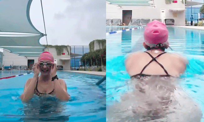 తాజాగా స్విమ్మింగ్ ఛాలెంజ్ను స్వీకరించి ఆపకుండా రెండు రౌండ్స్ స్విమ్ చేయడం ద్వారా అందరినీ సర్ప్రైజ్ చేసింది. ప్రొఫెషనల్ స్విమ్మర్స్ చేసినట్లుగా రకుల్ ప్రీత్ సింగ్ చేసిన స్విమ్మింగ్ అందరినీ సర్ప్రైజ్కి గురి చేసింది. రకుల్ ప్రీత్ సింగ్ అందంతో పాటు, మంచి ఫిజిక్ ఆమెను స్టార్గా నిలిపింది. ఇప్పటికీ సోషల్ మీడియాలో ఆమెకు మంచి ఫాలోయింగ్ ఉండటంకు ఆమె అందం కారణం అనడంలో సందేహం లేదు. ఆకట్టుకునే ఈ అమ్మడి యొక్క అందం కారణంగానే తిరిగి సినిమా ఇండస్ట్రీలో ఎంట్రీ ఇస్తుందనే విశ్వాసం వ్యక్తం అవుతోంది. ప్రస్తుతం ఈ అమ్మడి యొక్క అందాల ఆరబోత ఫోటోలతో పాటు, ఈ స్విమ్మింగ్ వీడియో కూడా అందరి దృష్టిని ఆకర్షిస్తుంది. రకుల్ ఇంత ఫిట్గా ఉండటానికి స్విమ్మింగ్ కూడా ఒక కారణం అంటూ నెటిజన్స్ కామెంట్స్ చేస్తున్నారు.