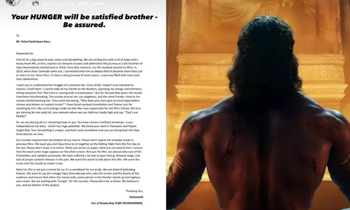 ఈ నేపథ్యంలో ఓ అభిమాని రాసిన భావోద్వేగ లేఖ ఇప్పుడు వైరల్ గా మారింది. యశ్వంత్ అనే అభిమాని దర్శకుడు రాహుల్ సాంకృత్యాన్ కు తాజాగా హార్ట్ టచింగ్ లేఖ రాశాడు. ఆ లేఖలో విజయ్ దేవరకొండపై తన అభిమానాన్ని, గత కొన్ని ఏళ్లుగా ఎదురైన నిరాశను వివరించాడు. 2018 నుంచి విజయ్ సినిమాల్ని ప్రాణంగా భావిస్తున్నానని, డియర్ కామ్రేడ్ సినిమా తన జీవితాన్ని మార్చిందని యశ్వంత్ పేర్కొన్నాడు.