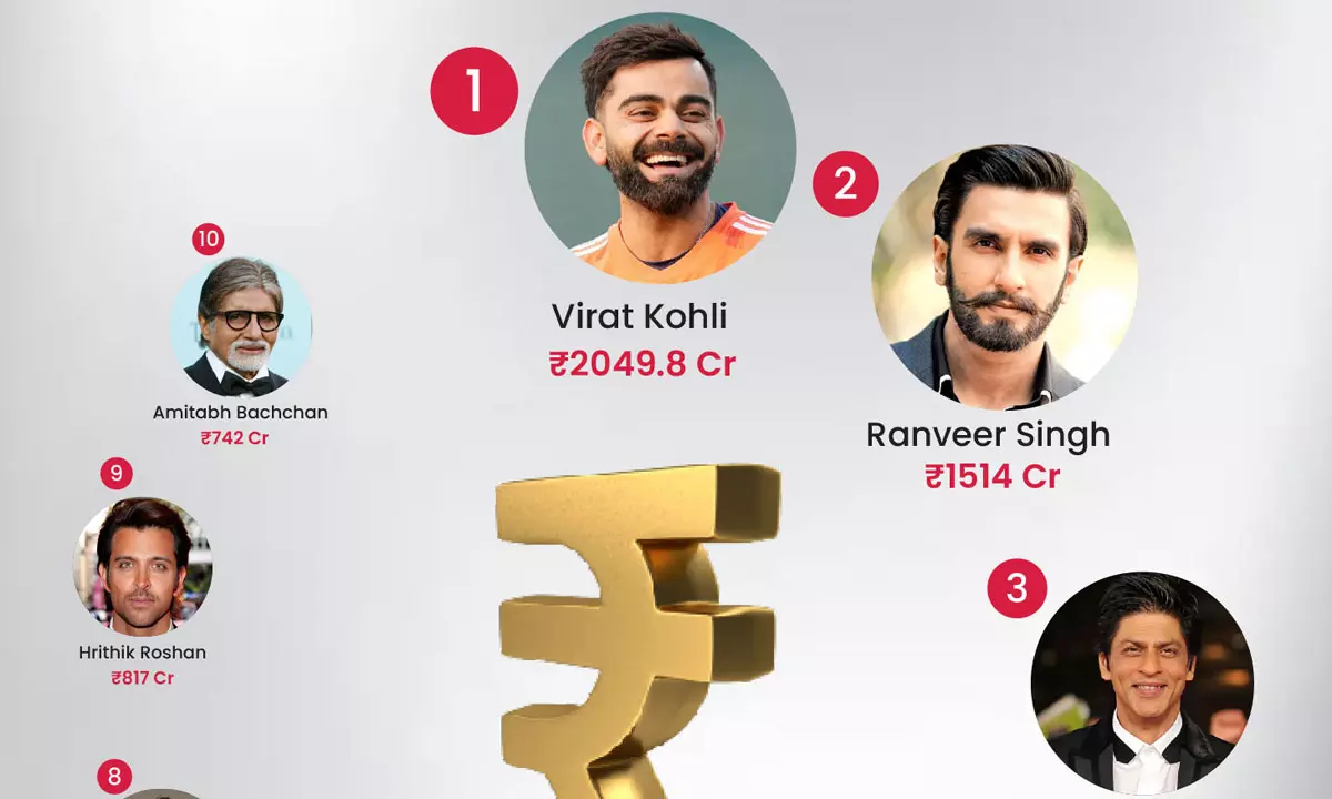 ఆలియా భట్ నాల్గవ స్థానంలో ఉండగా, 112.2 మిలియన్ డాలర్లతో సచిన్ టెండూల్కర్ ఐదవ స్థానంలో, 108 మిలియన్ డాలర్లతో అక్షయ్ కుమార్ ఆరో స్థానంలో, 102.9 మిలియన్ డాలర్లతో దీపికా పదుకునే ఏడో స్థానంలో, 102.8 మిలియన్ డాలర్లతో ధోనీ ఎనిమిదవ స్థానంలో, 92.2 మిలియన్ డాలర్లతో హృతిక్ రోషన్ తొమ్మిదో స్థానంలో, 83.7 మిలియన్ డాలర్లతో అమితాబ్ బచ్చన్ పదో స్థానంలో నిలిచారు. టాప్ 10 లో ఏడుగురు బాలీవుడ్కి చెందిన వారు కాగా, ముగ్గురు క్రికెట్కి చెందిన సెలబ్రిటీలు ఉండటం విశేషం. ఈ జాబితాలో సౌత్ స్టార్స్కి, ముఖ్యంగా టాలీవుడ్ స్టార్స్కి చోటు దక్కలేదు. వారి బ్రాండ్ వాల్యూ సౌత్ ఇండియాకే పరిమితం కావడంతో తక్కువ ఉన్నట్లు విశ్లేషకులు అభిప్రాయం వ్యక్తం చేస్తున్నారు. సోషల్ మీడియాలో ప్రస్తుతం ఈ జాబితా వైరల్ అవుతోంది. బిగ్గెస్ట్ బ్లాక్ బస్టర్ సినిమాలు చేసే సౌత్ స్టార్స్ బ్రాండ్ వాల్యూ చాలా తక్కువ ఉండటం ఏంటో అని కొందరు కామెంట్స్ చేస్తున్నారు.