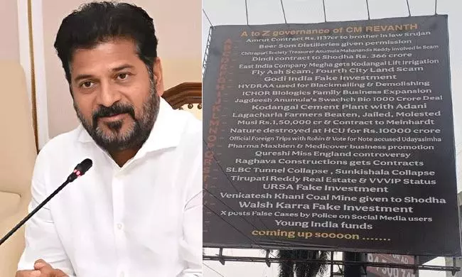 By: Tupaki Desk | 17 July 2025 6:34 PM ISTతెలంగాణ రాజకీయాలు మరోసారి హోర్డింగ్ల యుద్ధంతో వేడెక్కాయి. ముఖ్యమంత్రి రేవంత్ రెడ్డి ప్రభుత్వాన్ని లక్ష్యంగా చేసుకుని హైదరాబాద్తో పాటు రాష్ట్రంలోని ఇతర ప్రాంతాల్లో భారీగా "A to Z ఆఫ్ కరప్షన్" అనే శీర్షికతో కూడిన హోర్డింగ్లు, ఫ్లెక్సీలు దర్శనమిచ్చాయి. ఈ హోర్డింగ్లలోని ప్రతి అక్షరానికి ఒక అవినీతి ఆరోపణను జతచేయడం రాజకీయ వర్గాల్లో చర్చనీయాంశంగా మారింది.ఈ హోర్డింగ్లపై వాటిని ఎవరు ఏర్పాటు చేశారనే వివరాలు ఎక్కడా లేవు. అయితే, వాటిలో పొందుపరిచిన ఆరోపణలు, ప్రస్తుత ప్రతిపక్షాల వాదనలకు అనుగుణంగా ఉండటంతో, ఇది ఒక రాజకీయ ఎదురుదాడికి తెరలేపినట్టు అర్థమవుతోంది.