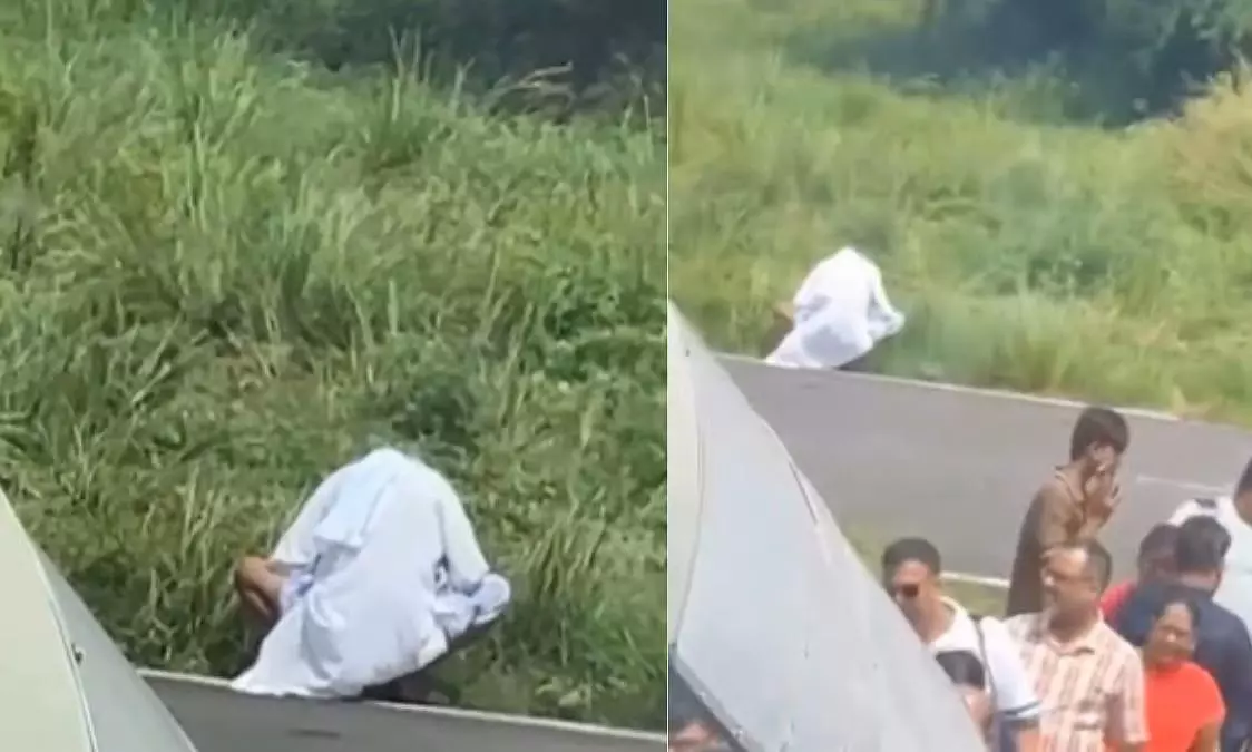 By: A.N.Kumar | 2 Sept 2025 2:20 PM ISTఎయిర్పోర్ట్ రన్వే పక్కన జరిగిన ఒక వింత సంఘటన ఇప్పుడు సోషల్ మీడియాలో వైరల్ అవుతోంది. పైలట్ కాక్పిట్లోంచి రికార్డ్ చేసినట్లు చెప్పబడుతున్న 9 సెకన్ల వీడియోలో, తెల్లని కుర్తా-పజామా ధరించిన ఓ వ్యక్తి విమానానికి కొద్ది మీటర్ల దూరంలో గడ్డిపైన కూర్చొని మూత్ర విసర్జన చేస్తున్నాడు.