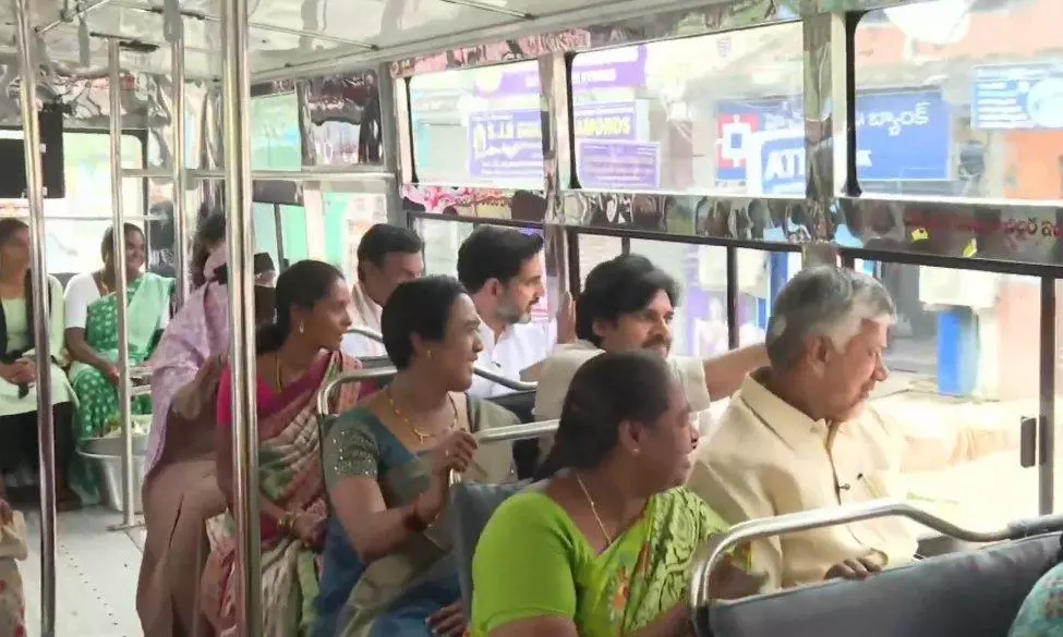 ఇక ముఖ్యమంత్రి చంద్రబాబుతో పాటు ఉచిత బస్సు ప్రయాణ పథకం - స్త్రీ శక్తిని ప్రారంభించేందుకు డిప్యూటీ సీఎం పవన్, మంత్రి లోకేశ్, బీజేపీ అధ్యక్షుడు మాధవ్ అదే బస్సులో ఉండవల్లి నుంచి విజయవాడ పీఎన్ బస్టాండ్ వరకు వచ్చారు.
