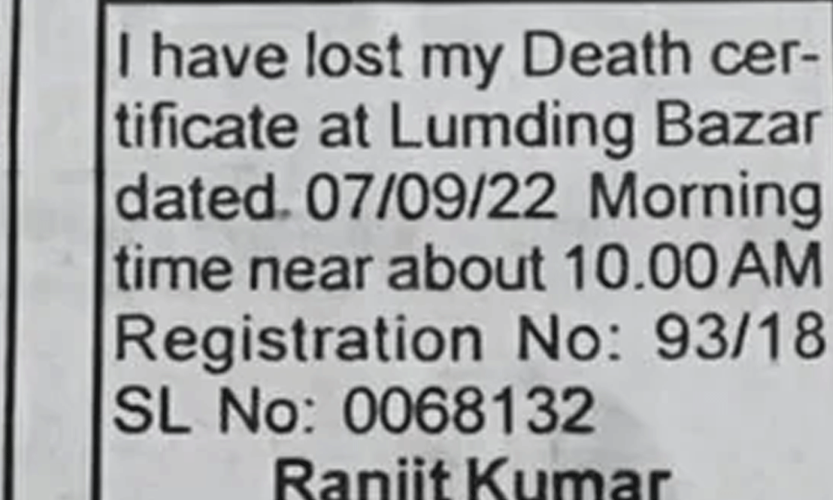 అవును... ఎవరైనా మరణించిన తర్వాత మాత్రమే జారీ చేయబడే డెత్ సర్టిఫికెట్ పోయిందంటూ ఓ వ్యక్తి ఇచ్చిన ప్రకటన ఇప్పుడు నెట్టింట చర్చకు దారితీసింది. ఇందులో ఒక వార్తాపత్రికలోని ఓ ప్రకటనలో.. రంజిత్ కుమార్ చక్రవర్తి సెప్టెంబర్ 7, 2022న ఉదయం 10 గంటల ప్రాంతంలో అస్సాంలోని లమ్డింగ్ బజార్ లో తన మరణ ధృవీకరణ పత్రాన్ని పోగొట్టుకున్నట్లు ఆ ప్రకటనలో పేర్కొన్నారు.