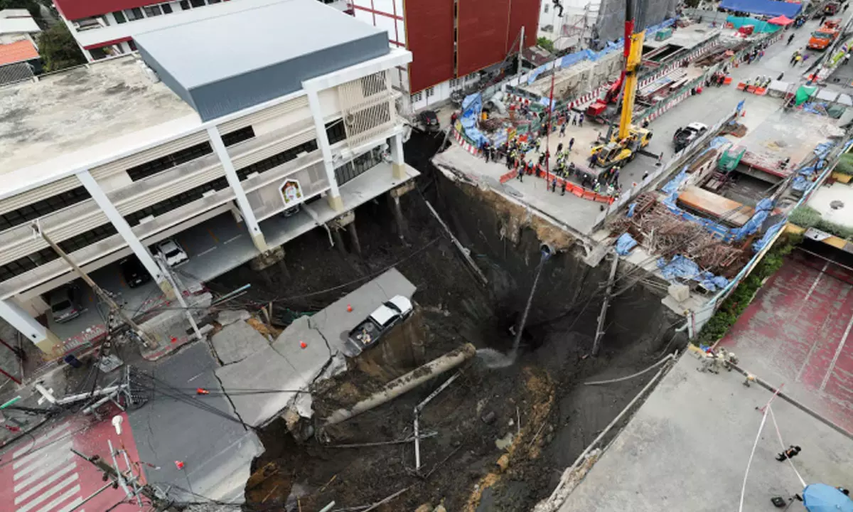 ఉన్నట్లుండి కాళ్ల కింద ఉన్న భూమి కుంగితే ఎలా ఉంటుంది..? ఇప్పడు బుధవారం బ్యాంకాక్లో అదే జరిగింది. ఓ భారీ రోడ్డు నిలువునా కుంగింది. స్థానికంగా ఉన్న వజీరా ఆస్పత్రి ముందు ఏకంగా 50 మీటర్ల లోతున సింక్ హోల్ ఏర్పడింది. ఇది క్రమంగా పెరుగుతూ ఆందోళన కలిగిచింది. చివరకు రోడ్డు కుంగుబాటు సామ్సెన్ పోలీస్ స్టేషన్ వరకు విస్తరించింది.