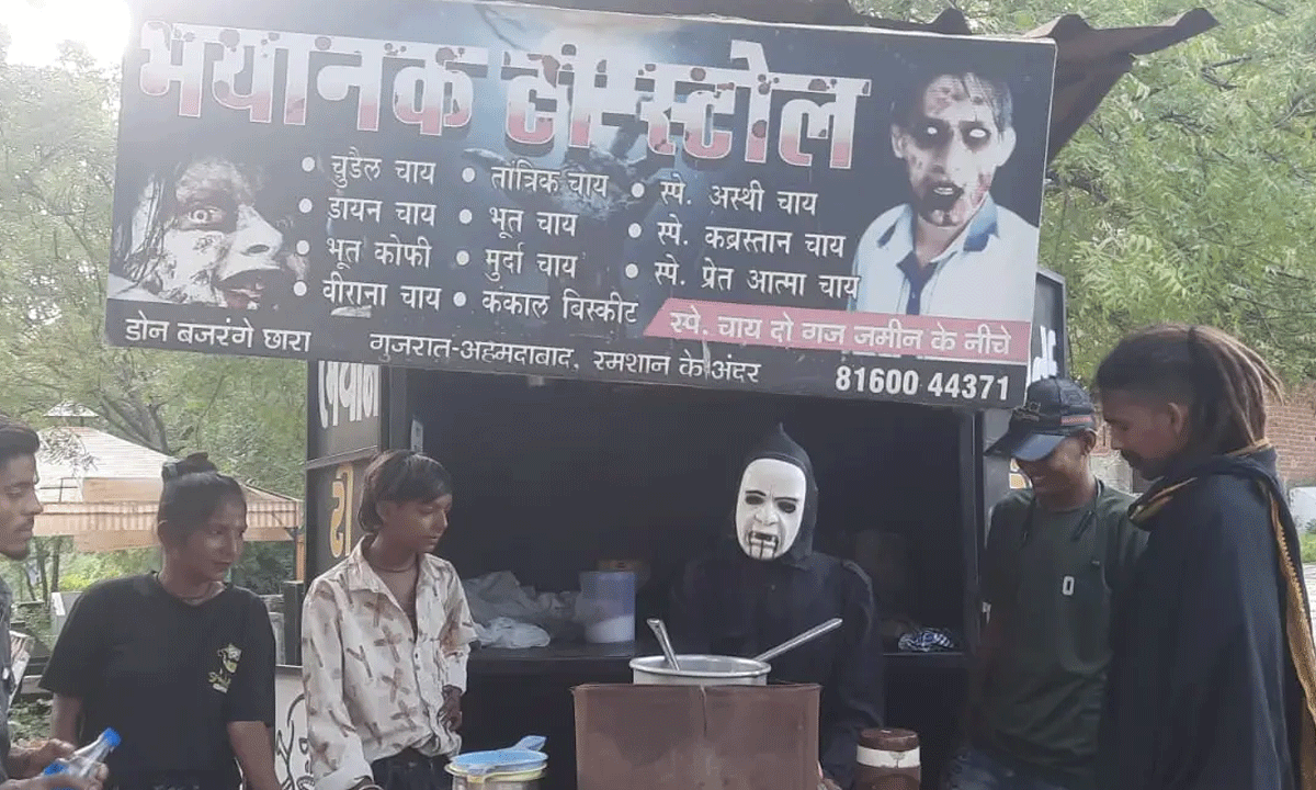 ఈ దరిద్రం గుజరాత్ లో చోటు చేసుకుంది. గుజరాత్ రాష్ట్ర రాజధాని అహ్మదాబాద్ ఎయిర్ పోర్టు సమీపంలోని హోంసోల్ ప్రాంతంలో భద్రేశ్వర్ శ్మశానవాటిక ఉంది. అందులో భయానక్ పేరుతో భయం కలిగించే పేరుతో ఒక టీ స్టాల్ ఓపెన్ చేవాడు అనిల్ బజరంగే ఛారా అనే కుర్రాడు. సాధారణంగా మాల్స్ లో హారర్ థీమ్ తో పార్కుల్ని ఏర్పాటు చేయటం.. డబ్బులు చెల్లించి మరీ భయపడే క్రేజీ థాట్ ను కాపీ కొట్టాడో ఏమో కానీ.. ఆ తరహాలోనే హారర్ థీమ్ తో టీస్టాల్ ఏర్పాటు చేశాడు.