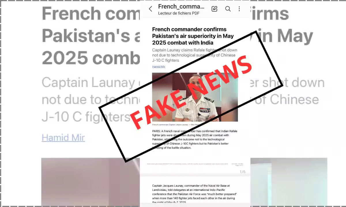 ఆపరేషన్ సిందూర్ సమయంలో ఫ్రెంచ్ కమాండర్ కెప్టెన్ జాక్విస్ లానే వైమానిక దాడిలో పాకిస్థాన్ ఆధిపత్యాన్ని ధృవీకరించారని పాకిస్థాన్ జియో టీవీ ఒక కథనాన్ని ప్రచురించింది. ఇందులో భాగంగా... పాకిస్థాన్ వైమానికి దళం మెరుగ్గా సిద్ధంగా ఉందని పేర్కొంది. దీనిపై తాజాగా స్పందించిన ఫ్రెంచ్ నావికాదళం.. దాన్ని "నకిలీ వార్తలు" అని పేర్కొంది.