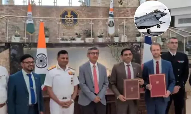 By: Tupaki Desk | 28 April 2025 8:39 PM ISTప్రస్తుతం భారత్, పాకిస్థాన్ మధ్య నెలకొన్న ఉద్రిక్త పరిస్థితుల నేపథ్యంలో భారత రక్షణ రంగానికి, ముఖ్యంగా నౌకాదళ సామర్థ్యానికి ఇది ఒక బృహత్తర బలం చేకూర్చే పరిణామం. భారత్ తన సముద్ర భద్రతా సామర్థ్యాలను మరింత పటిష్ఠం చేసుకునే దిశగా ఫ్రాన్స్తో కీలక ఒప్పందం కుదుర్చుకుంది. రఫేల్ మెరైన్ యుద్ధ విమానాల కొనుగోలుకు సంబంధించిన ఈ డీల్ విలువ సుమారు రూ.63,000 కోట్లు. దీనిపై అధికారికంగా సోమవారం సంతకాలు జరిగాయి.
