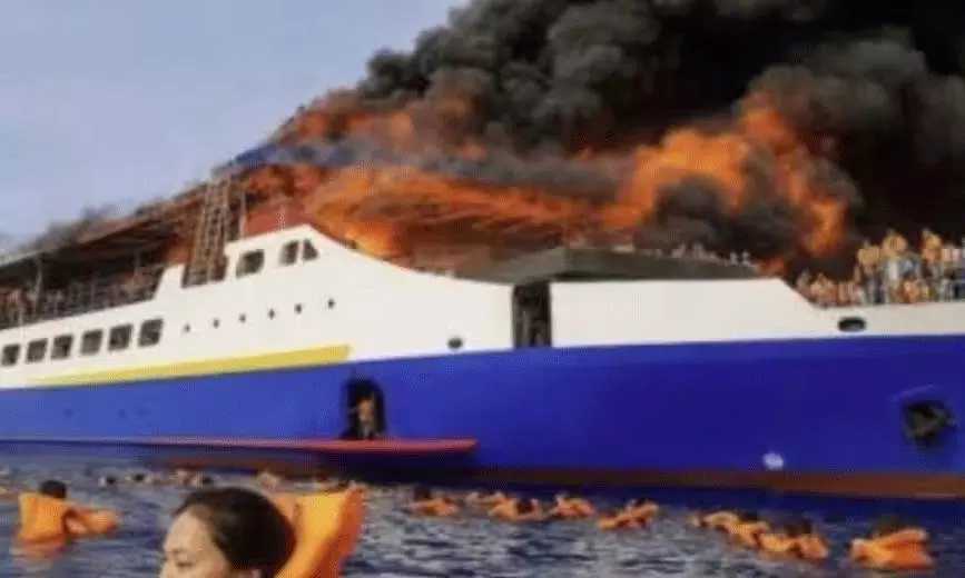 ఫెర్రీలో భారీ మంటలు.. సముద్రంలోకి దూకిన ప్రయాణికులు.. వైరల్ వీడియో!