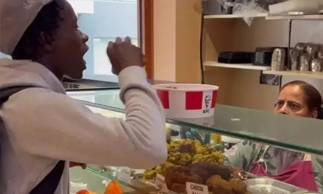 రెస్టారెంట్లో కేవలం శాకాహార వంటకాలు మాత్రమే ఉంటాయని సిబ్బంది చెప్పిన తర్వాత కూడా అతను తన కేఎఫ్సీ బాక్స్లోని చికెన్ను బయటికి తీసి, కౌంటర్ దగ్గరే తినడం మొదలుపెట్టాడు.