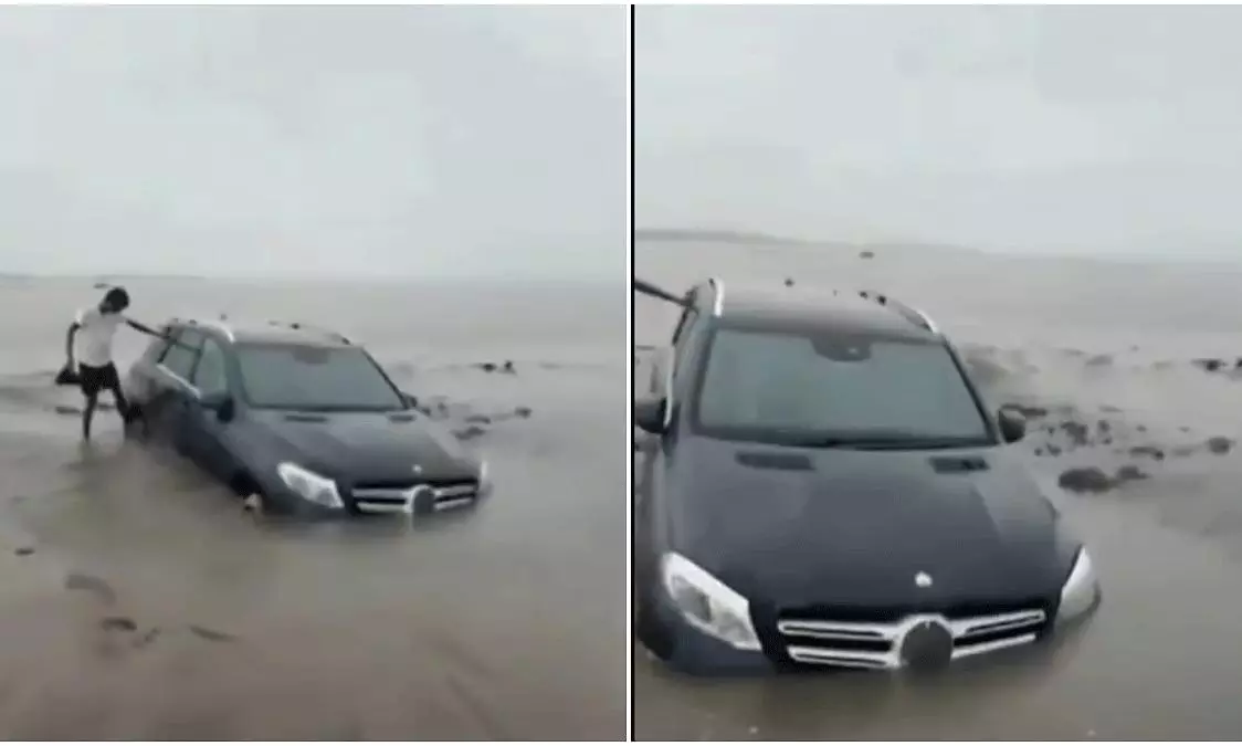 బెంజ్ కారుని సబ్ మెరైన్ చేద్దామనుకున్నారా?... బీచ్ లో వీడియో వైరల్!