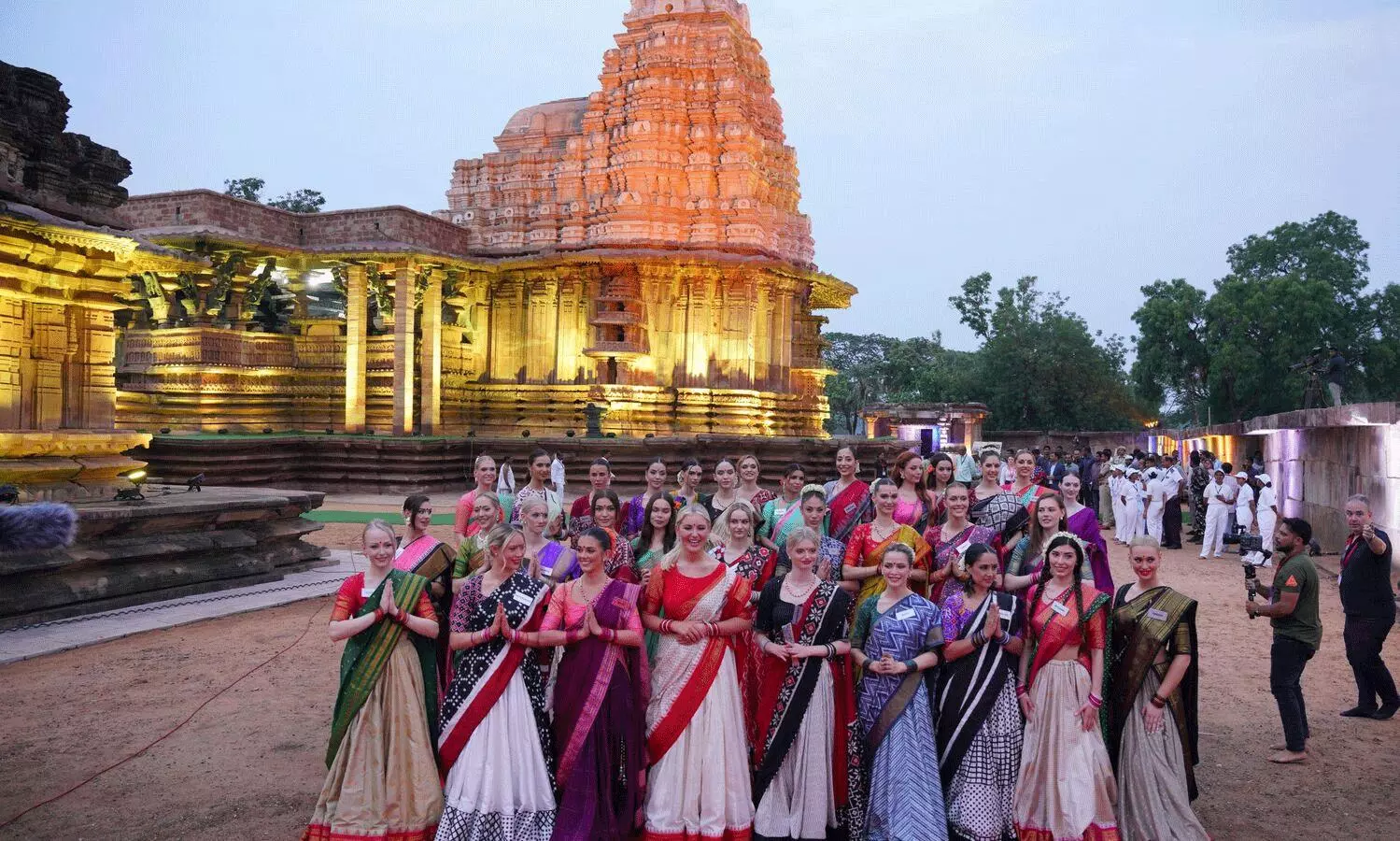 బుధవారం ఉమ్మడి వరంగల్ లోని పలు దర్శనీయస్థలాల్ని చూసేందుకు వెళ్లిన 30 దేశాలకు పైనే అందాల భామలు.. ఆయా ప్రాంతాల్లోని విశేషాల గురించి విని విస్మయానికి గురయ్యారు. అన్నింటికి మించి రామప్ప దేవాలయంలోని కళా సంపదకు అచ్చెరువు పొందారు. రామప్ప ఆలయానికి వెళ్లే వేళలో.. వారి ప్రాశ్చాత్య వస్త్రాల్ని వదిలేసి.. సంప్రదాయ చీరకట్టులోకి మారిపోయారు. కొన్ని నిమిషాల వ్యవధిలోనే వీరంతా చీరకట్టులోకి మారిపోవటం.. నుదిటిన బొట్టు పెట్టుకొని.. జడలు వేసుకొని.. పూలు అలంకరించుకోవటంతో పాటు.. చేతులకు గాజులు వేసుకొన్న వైనం చూసినప్పుడు ప్రపంచ అందాలన్ని తెలుగు అందాలుగా మారిపోయిన వైనం కనిపిస్తుంది.