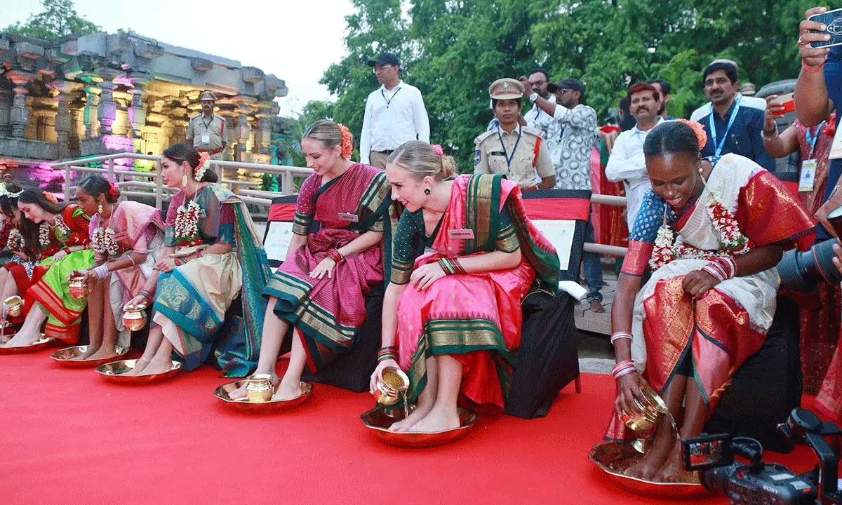 రామప్ప టెంపుల్ ముందు స్టూల్స్ వేసి.. వాటిపై వివిధ దేశాల సందరీమణులు కూర్చున్న తర్వాత.. వారి కాళ్లను బంగారు వర్ణంలోని ప్లేటల్లో ఉంచి.. వారి పాదాల్ని నీళ్లతో కడిగారు పలువురు మహిళలు. ఈ సంప్రదాయానికి విదేశీ మహిళలు ఫిదా కావటమే కాదు.. ఇలాంటి కల్చర్ వారిని విస్మయానికి గురయ్యేలా చేసింది. నిజానికి ఈ సంప్రదాయం వెనుక ఉన్న ఉద్దేశం.. ఇంటికి వచ్చిన అతిధులకు ఎలాంటి అహం లేకుండా వారికి మర్యాదలు చేస్తానని చెప్పటమే నిదర్శనం. సోదర భావం.. ప్రేమాభిమానాల్ని పెంచేందుకు వీలుగా ఉండే ఈ సంప్రదాయం వారిని ఆశ్చర్యానికి గురయ్యేలా చేసింది.