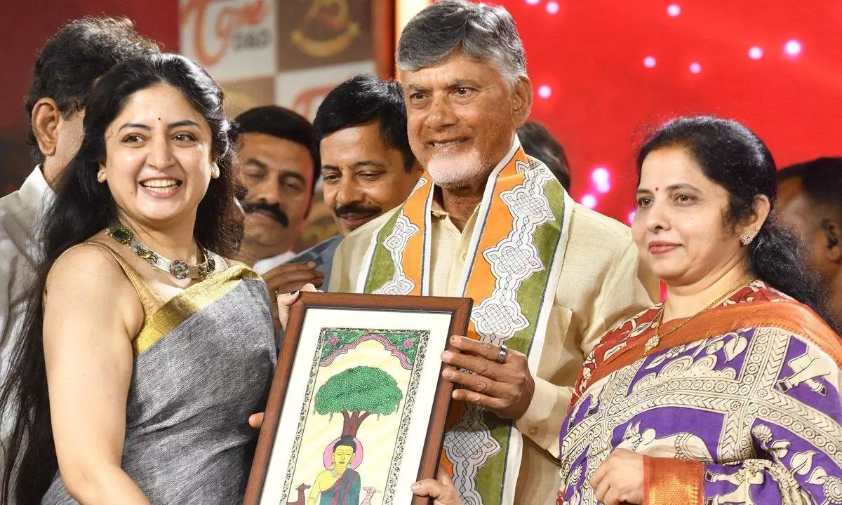 హైదరాబాద్లో జరిగిన ఓ డిజిటల్ మీడియా సంస్థ వజ్రోత్సవ వేడుకలకు ముఖ్యమంత్రి చంద్రబాబు నాయుడు ముఖ్య అతిథిగా హాజరయ్యారు. ఈ కార్యక్రమంలో పలువురు సినీ, రాజకీయ ప్రముఖులు పాల్గొన్నారు. ఈ సందర్భంగా పూనమ్ కౌర్ ముఖ్యమంత్రి చంద్రబాబును కలిసి, ఆయనకు ఒక ప్రత్యేక బహుమతిని అందజేశారు. అమరావతి ఆత్మను ప్రతిబింబించేలా చేతితో తయారుచేసిన పటాచిత్ర కళాఖండాన్ని ఆమె బహుకరించారు.