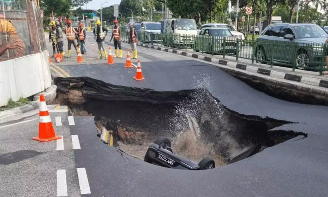 సింగపూర్ నేషనల్ వాటర్ ఏజెన్సీ వెల్లడించిన వివరాల ప్రకారం... ఈ సంఘటన శనివారం సాయంత్రం 5:50 గంటలకు జరిగింది. ఈ సందర్భంగా... ఆన్ లైన్ లో ప్రసారం అవుతున్న డాష్ క్యామ్ ఫుటేజ్ లో రోడ్డు అకస్మాత్తుగా లోయలోకి కృంగిపోయింది.. దీంతో, ఒక వాహనం ఆ లోతైన రంధ్రంలో పడిపోయింది. దీంతో.. సమీపంలోని కార్మికులు వెంటనే స్పందించారు.
