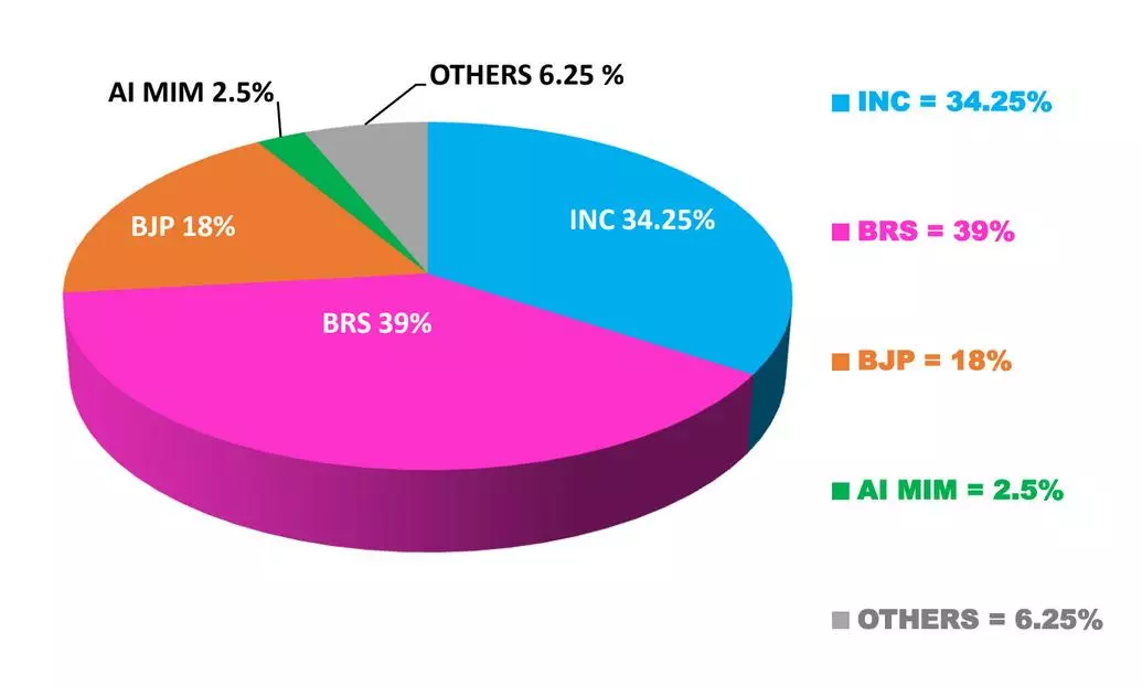 బీఆర్ఎస్: 39% (2023 తో పోలిస్తే 1.65% పెరుగుదల)