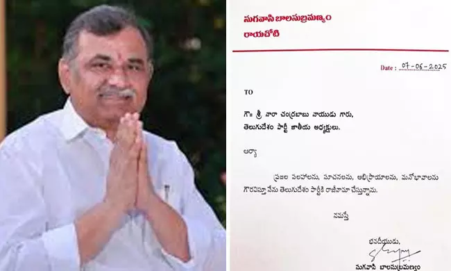 ఇందులో భాగంగా... గౌరవనీయులైన చంద్రబాబు నాయుడు, టీడీపీ జాతీయ అధ్యక్షులు అని అడ్రస్ చేస్తూ... "ప్రజల సలహాలను, సూచనలను, అభిప్రాయాలను, మనోభావాలను గౌరవిస్తూ నేను తెలుగుదేశం పార్టీకి రాజీనామా చేస్తున్నాను.. నమస్తే" అంటూ పార్టీ అధినేత చంద్రబాబుకు రాసిన లేఖలో బాలసుబ్రహ్మణ్యం పేర్కొన్నారు.
