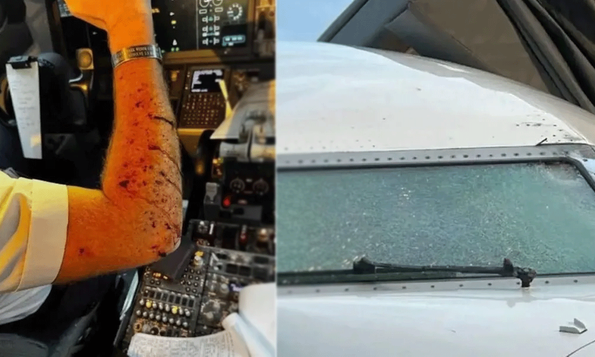 కాక్పిట్లో ఆ వస్తువు వేగంగా దూసుకువచ్చింది. పైలట్ చేతికి గాయమై రక్తం కారడం మాత్రమే కాకుండా, విండ్షీల్డ్ చుట్టూ కాలిన గుర్తులు కనిపించాయి.