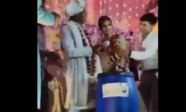 పెళ్లి వేడుక జరుగుతుండగా పెళ్లి కొడుకు ఫ్రెండ్స్ ఒక పెద్ద బ్లూ కలర్ ప్లాస్టిక్ డ్రమ్ను మోసుకుంటూ వేదికపైకి వచ్చారు. కొందరు నవ్వుతూ ఫోటోలు తీస్తుండగా, చాలా మంది మాత్రం ఇబ్బందిగా కనిపించారు. పెళ్లికూతురు ఆశ్చర్యంతో నవ్వినా, పెళ్లికొడుకు మాత్రం కాస్త కలవరపడుతూ కనిపించాడు.