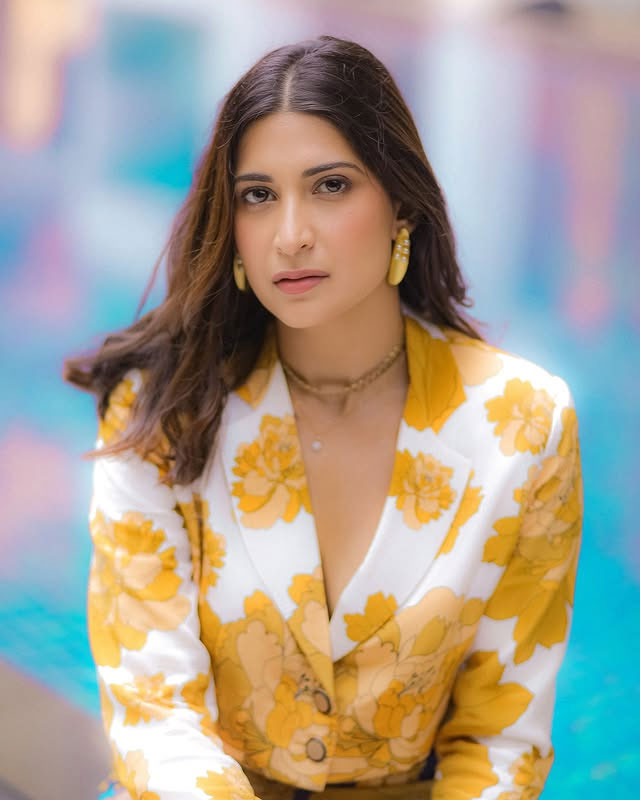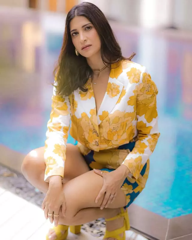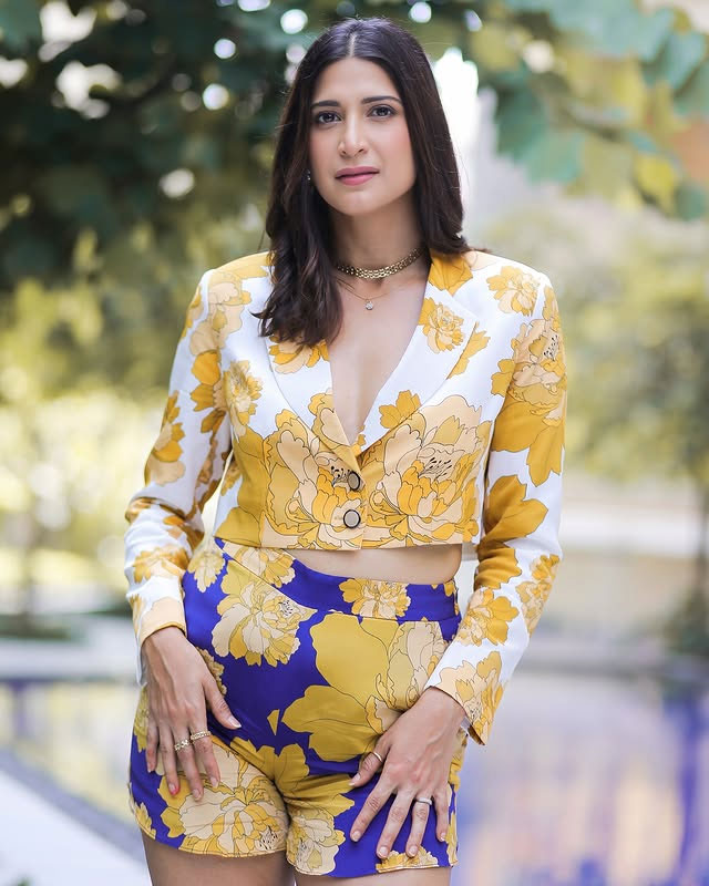 In the photo, Aahana is walking across a tiled floor indoors. She is dressed in a black floral print two-piece with a long slit. She completed her look with statement earrings and lime-green flats. The post feels soft and slow, just like the rain-filled days.