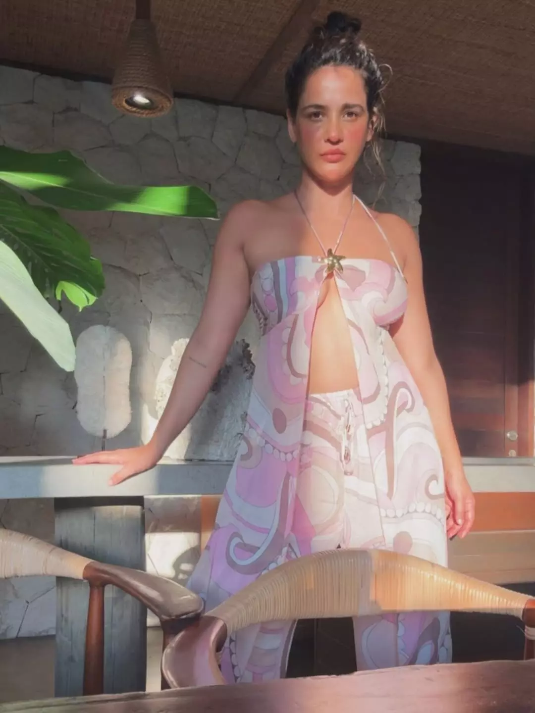 Amidst the sun-kissed serenity of a Balinese villa, Aisha Sharma blooms like a hibiscus in bloom, her lithe silhouette framed by lush ferns and coral walls. In a daring pink and white printed jumpsuit—its tube top plunging into a cut-out navel tease, wide-leg pants swirling like ocean waves she adjusts a golden starfish pendant that catches the light like a siren's call.