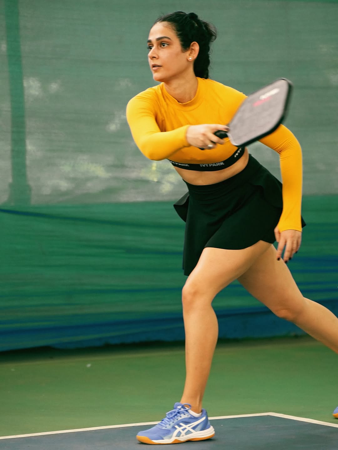 Aakanksha Singh shared a new post on Instagram that showed her energy and focus on the court. She is dressed in a sporty look with a bright yellow top, black skirt, and blue sneakers. She is seen holding a pickleball paddle as she prepares for a strong shot. Her expression shows determination and passion for the game.