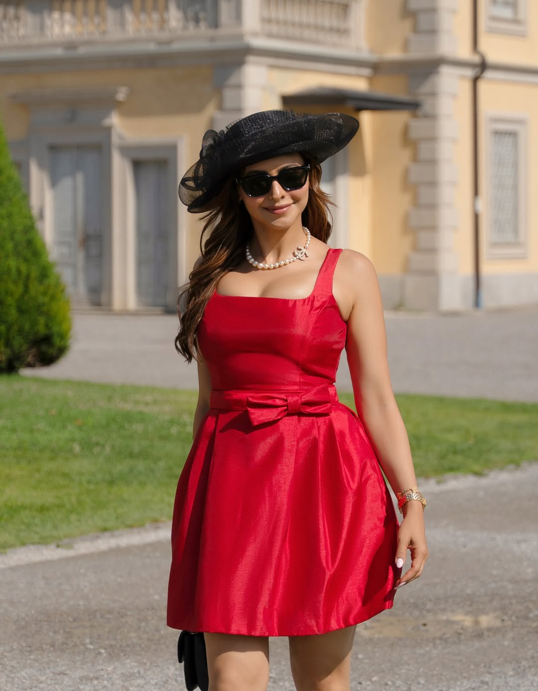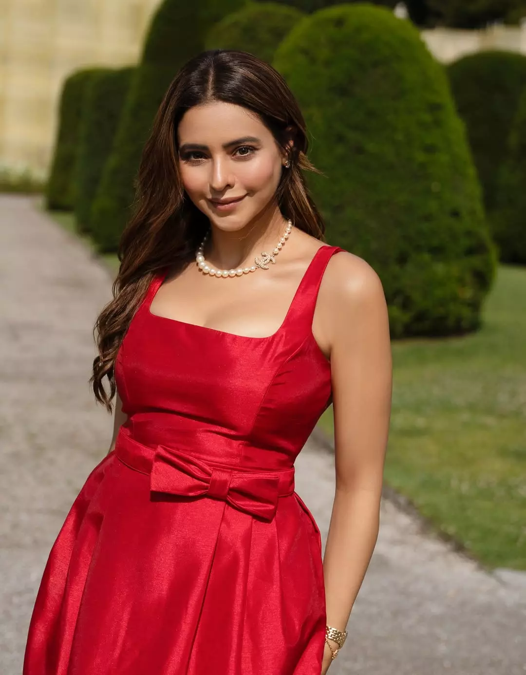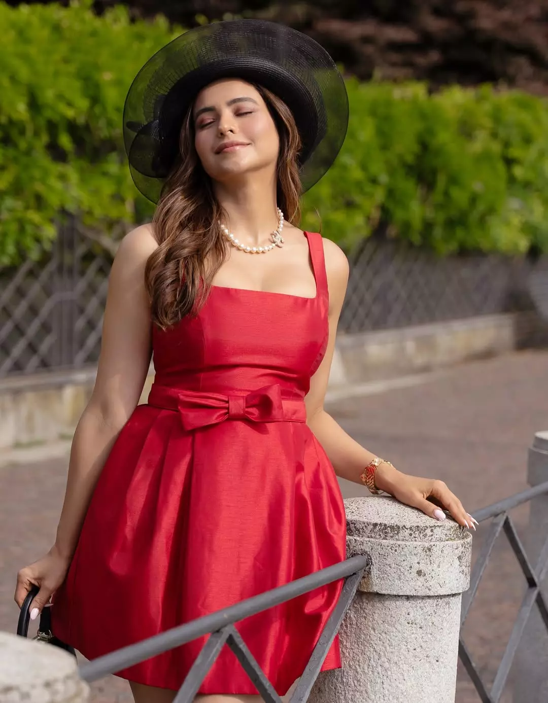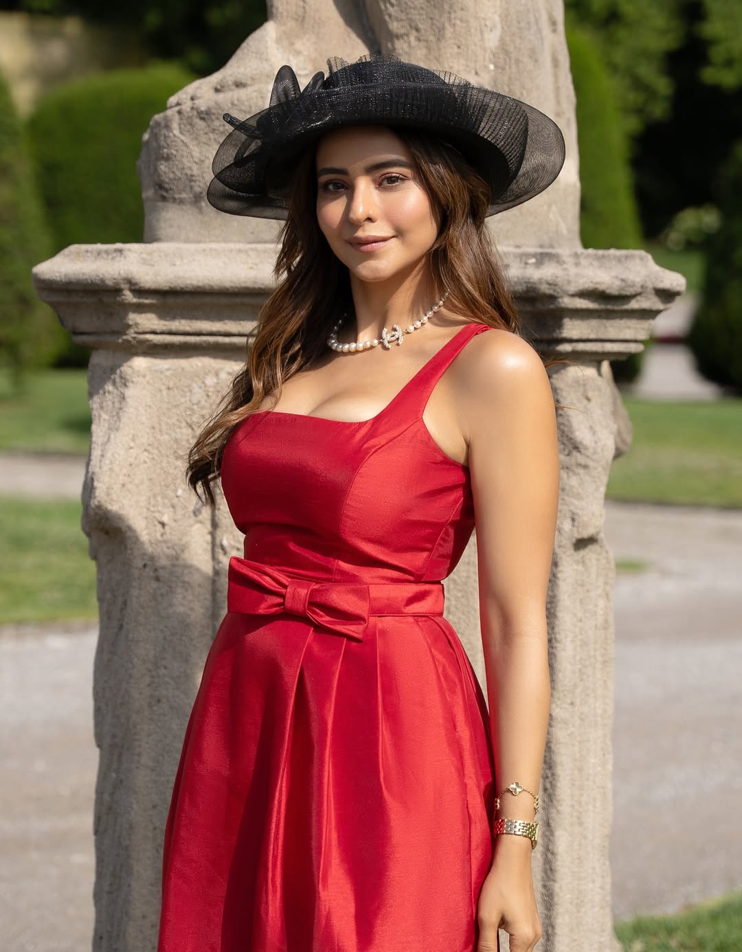 Aamna Sharif looks radiant in this elegant red dress, paired beautifully with a chic black hat and a pearl necklace. Her graceful smile and poised charm add a timeless touch, making the moment feel straight out of a royal portrait. Truly, this picture feels like chasing fairytales ❣️ in the most sophisticated way.