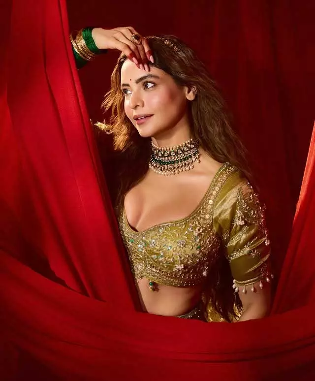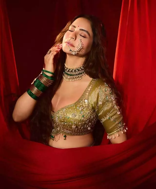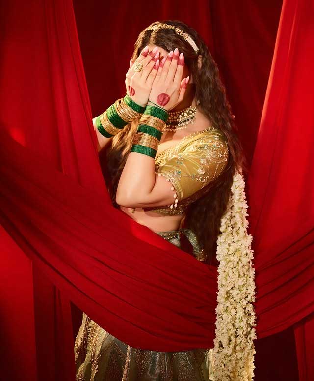 Television actress Aamna Sharif shared a striking image on Instagram just minutes ago capturing attention with a timeless moment. In the photo, she’s seen holding up long strings of jasmine flowers dressed in traditional attire with deep red drapes in the background. The intense gaze, golden embroidery and her signature long hair add a sense of vintage charm. Her caption is simple, marked by a red heart:
