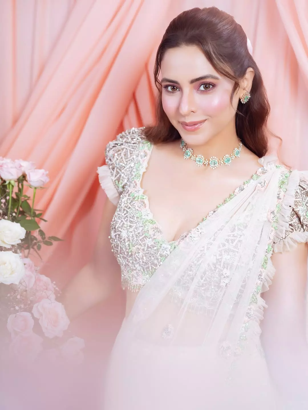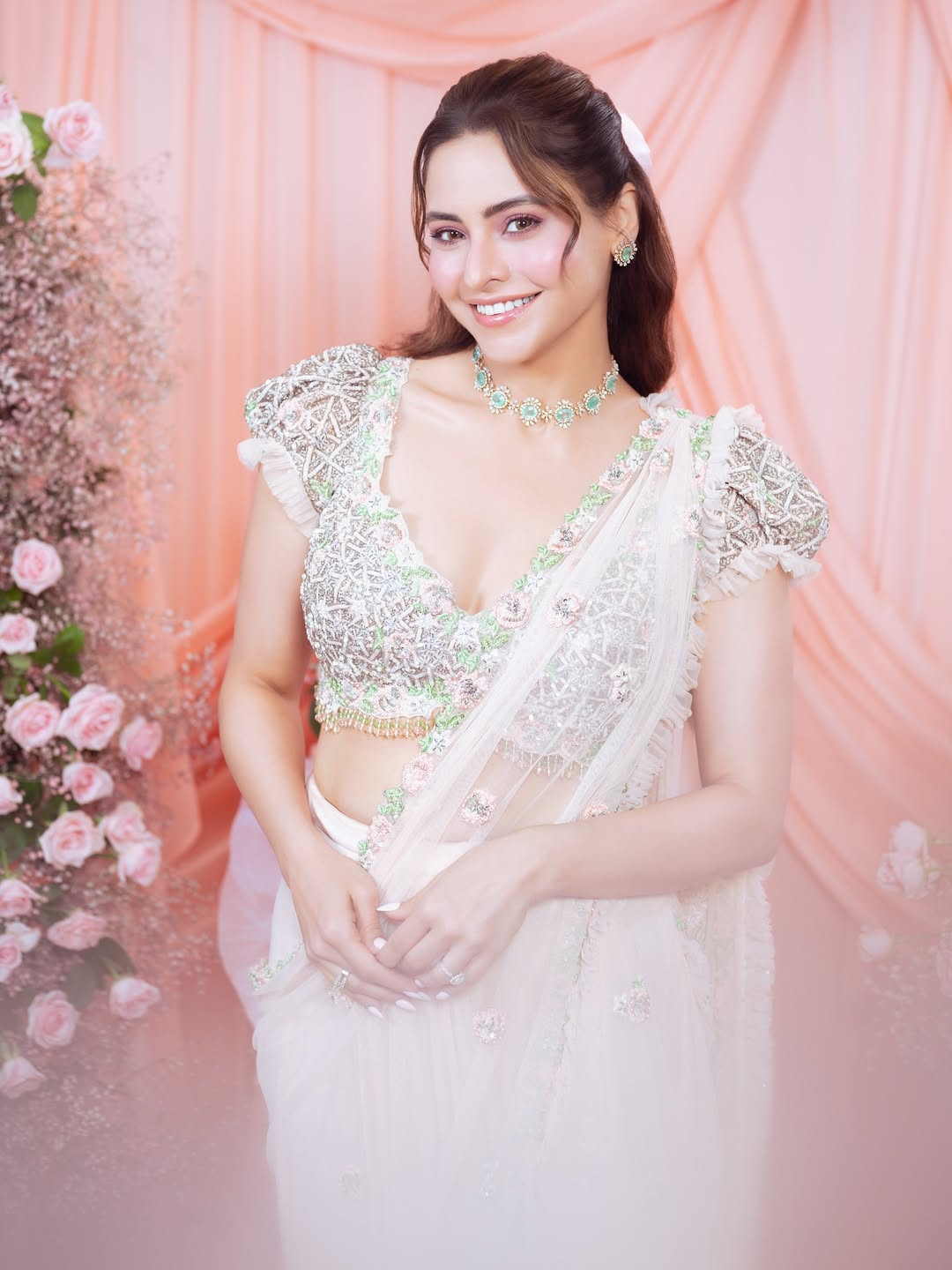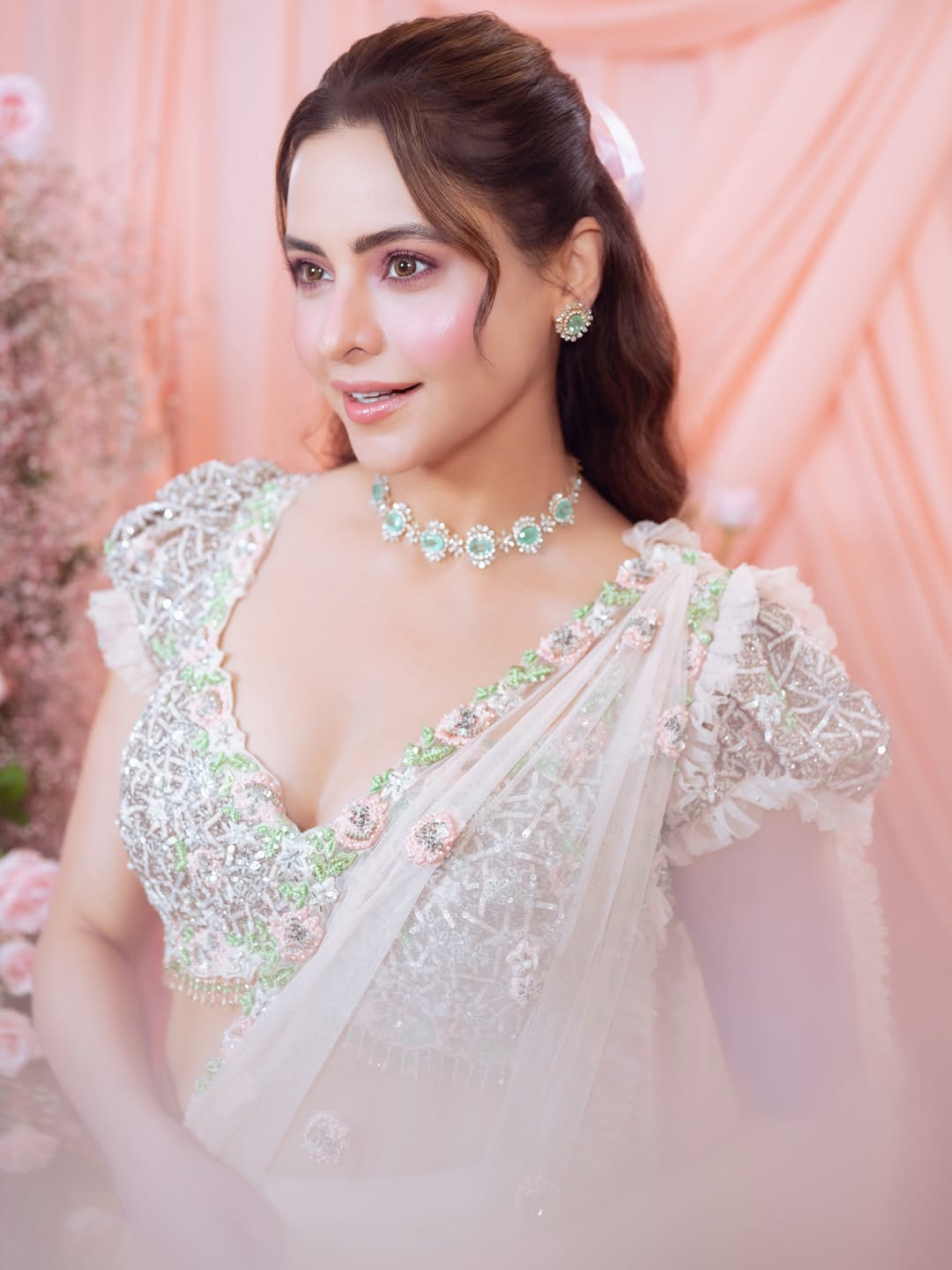 Aamna Sharif's latest Instagram post showcases her stunning appearance in a light pink ensemble. She is seen wearing a delicate saree with intricate floral embroidery, paired with minimalistic jewelry. The caption reads: "Kaisi lag rahi hoon main?" which translates to "How do I look?" The photo is captured by @deepak-_das-_photography, with makeup by @mukeshpatilmakeup and hair by @little-_hair-_poetry. The jewelry is designed by @anmoljewellers, with rings from @arcticstarjewels, and the bag is from @dior.