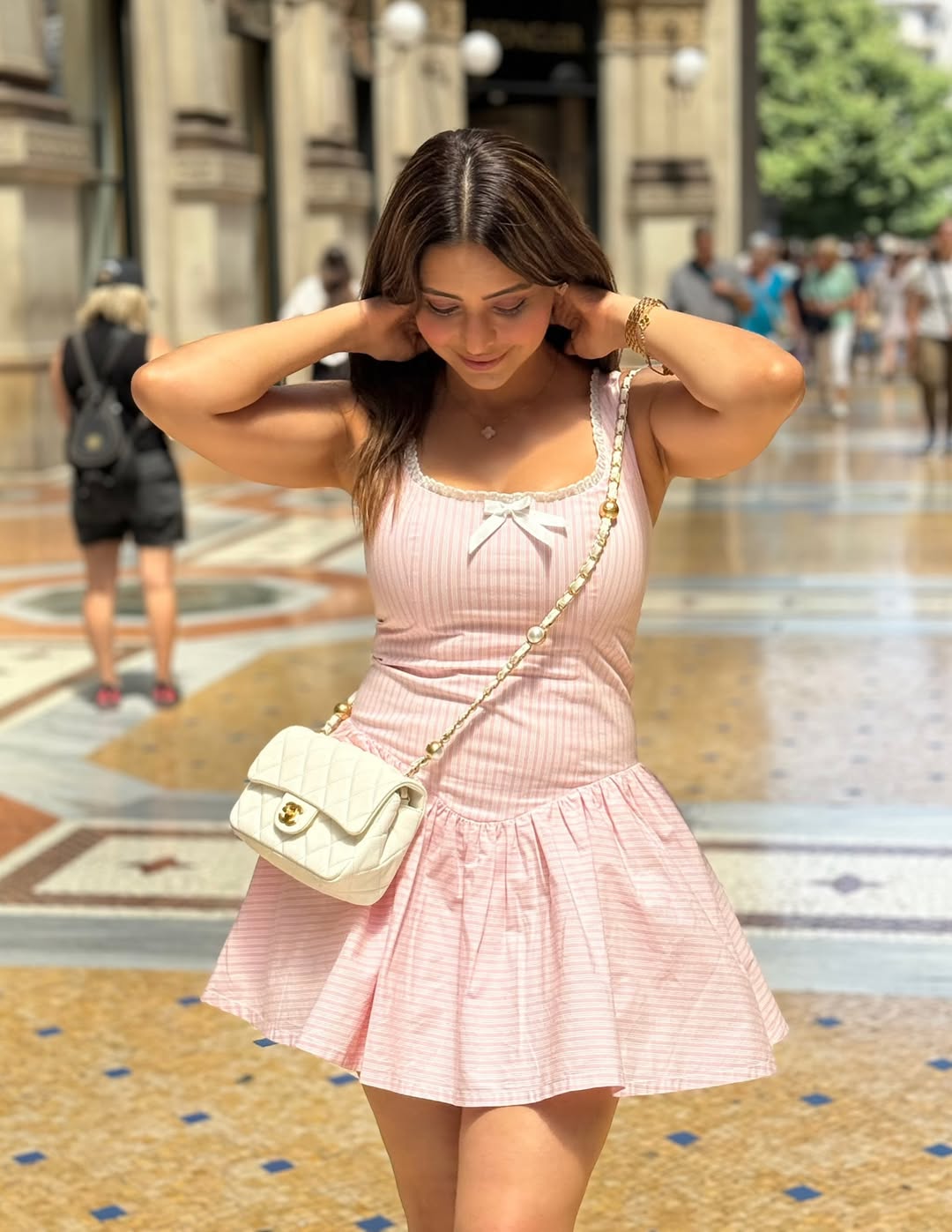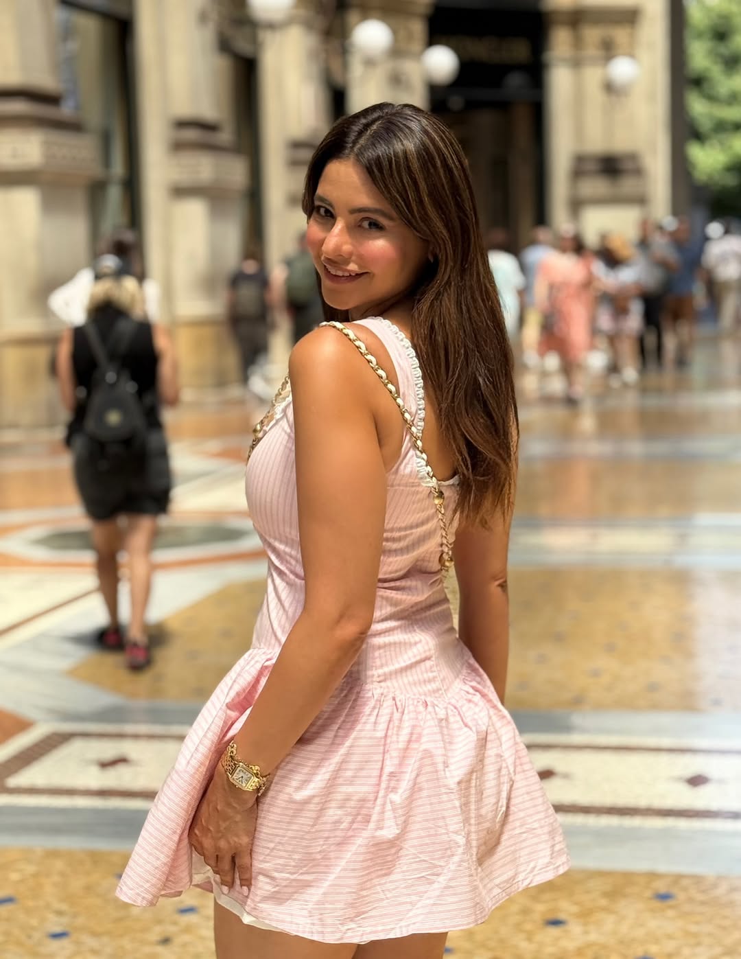In the photo, Aamna can be seen standing in a beautiful gallery street of Milan, Italy. She wore a sleeveless pink dress with delicate straps, paired with a golden wristwatch, while keeping her hair straight and simple.