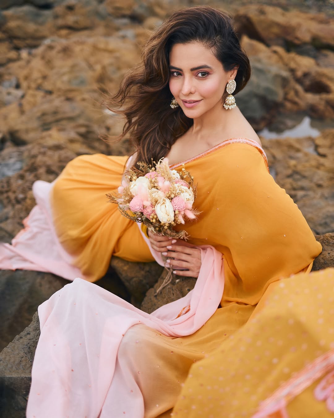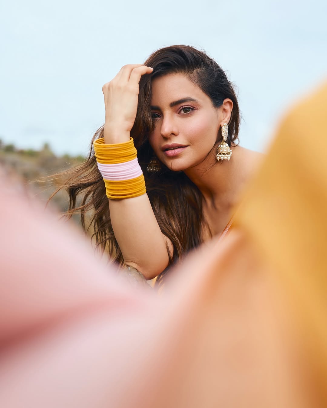 Aamna Sharif shared a new picture on Instagram. She wore a soft yellow saree with a pink border. She added matching bangles in mustard and light pink and the photo showed her glowing skin and gentle smile.