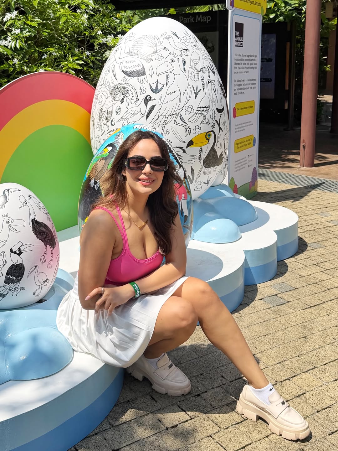 Aanchal Munjal looks radiant and cheerful in a vibrant pink top paired with a white pleated skirt, flashing her signature bright smile on a sunny day