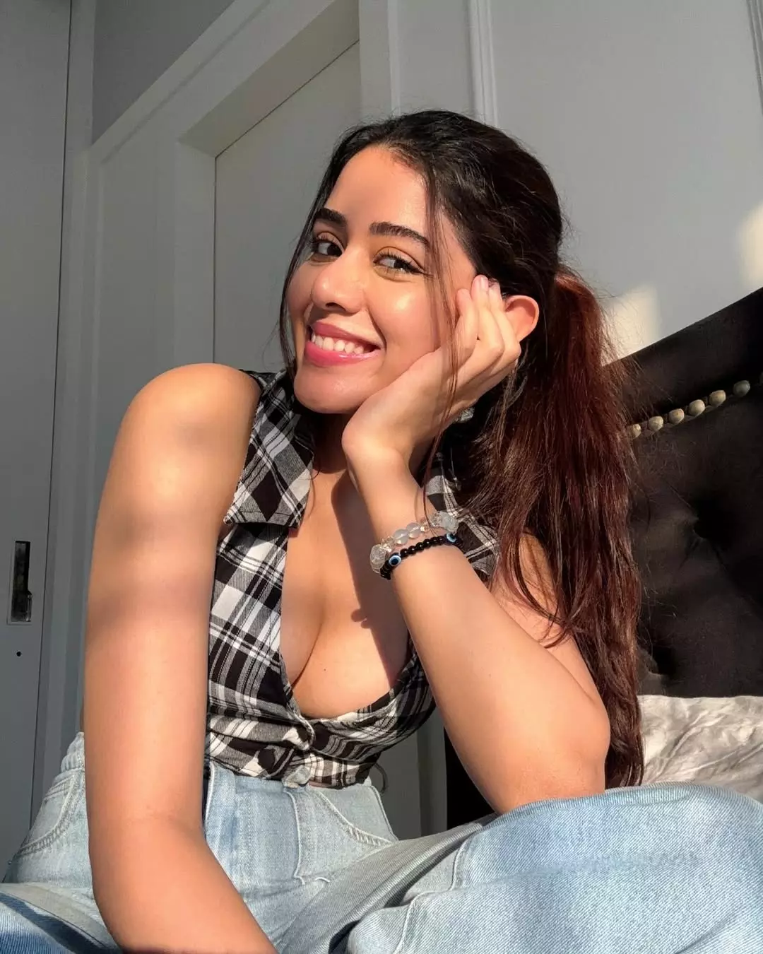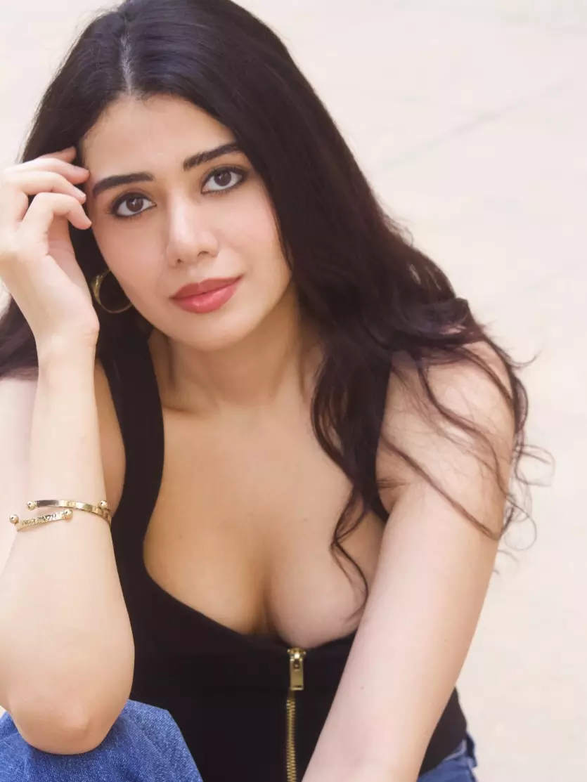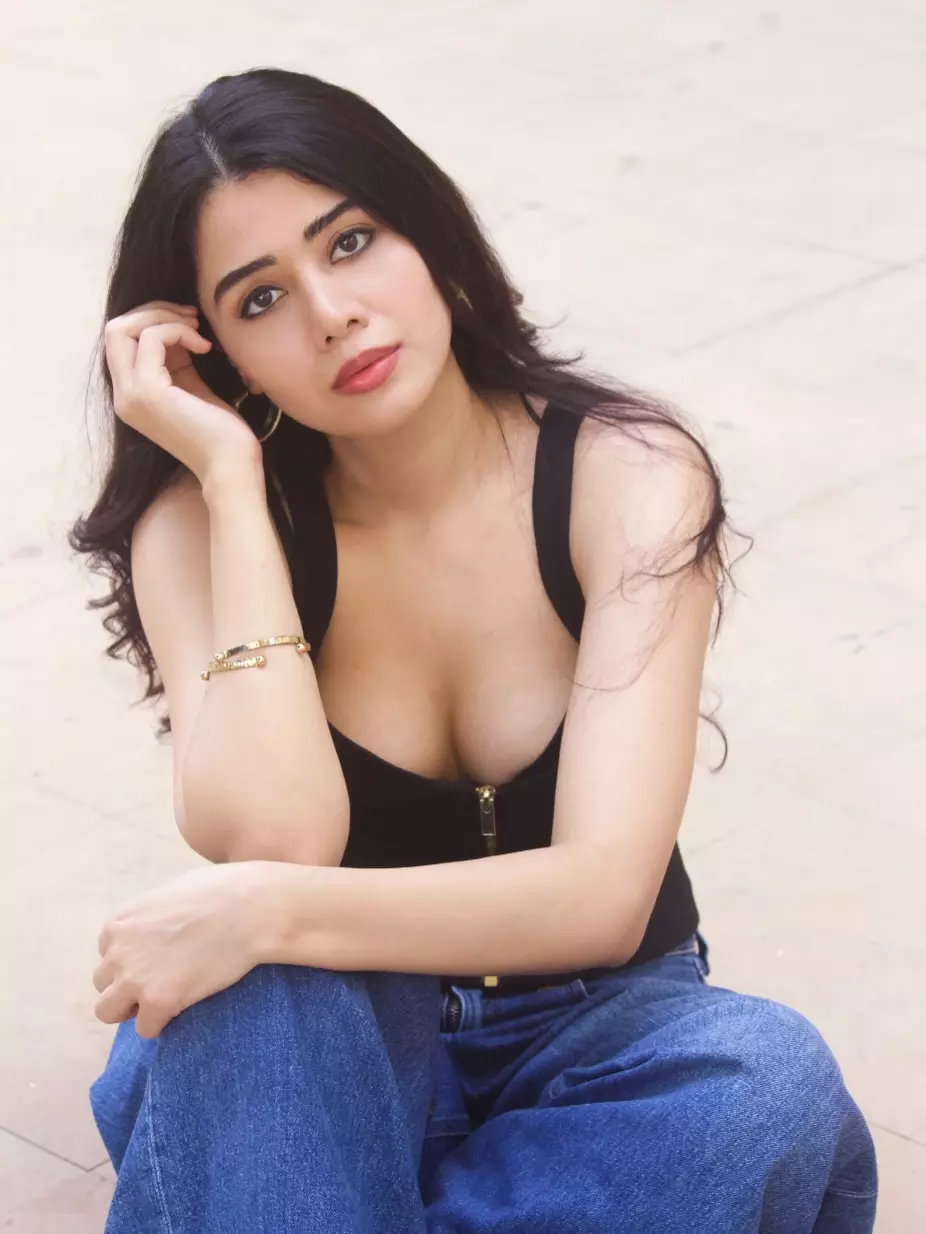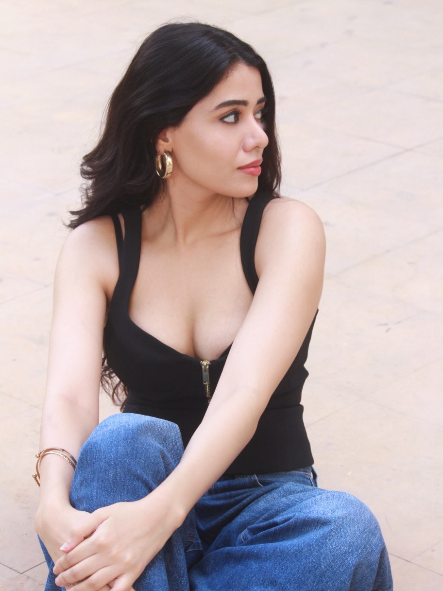 This radiant photograph of Aarti Chikara captures her infectious smile and effortless charm as she sits casually in a stylish black zip-up top paired with blue denim.