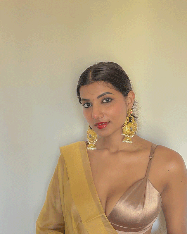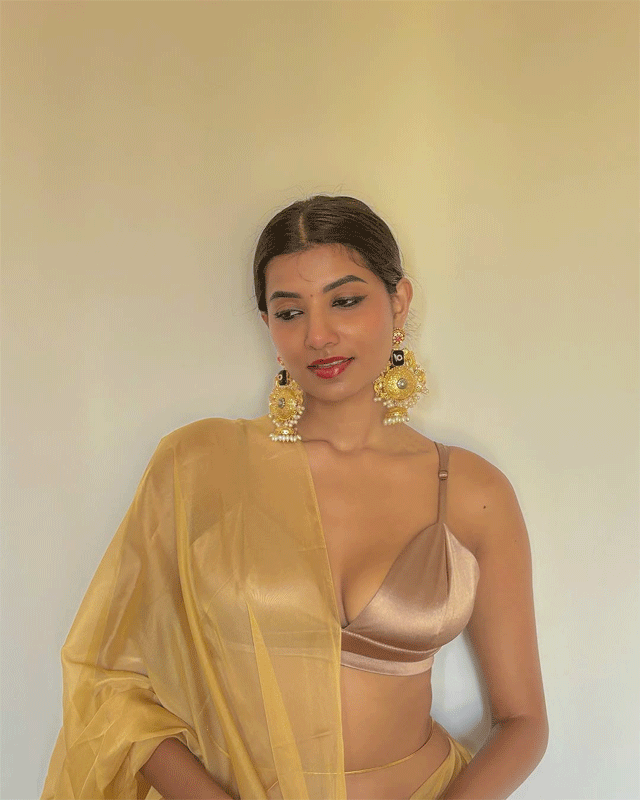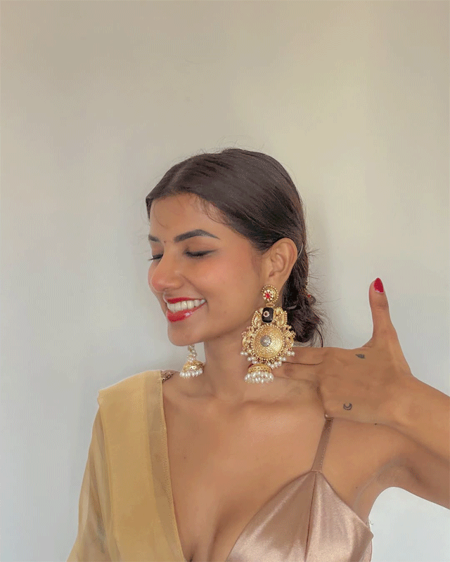 Aastha Sharan recently shared a striking picture on Instagram captioned “Head to waist in @advaileela”by showcasing her elegant ethnic style. She is seen draped in a golden sheer saree with a satin blouse, she exudes confidence and grace. Her radiant smile and statement earrings elevate the look even more.