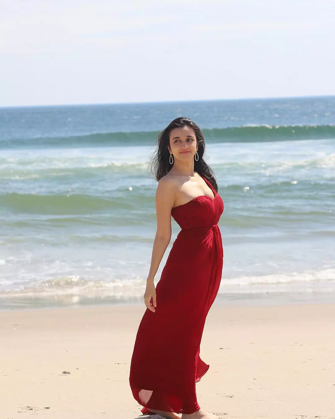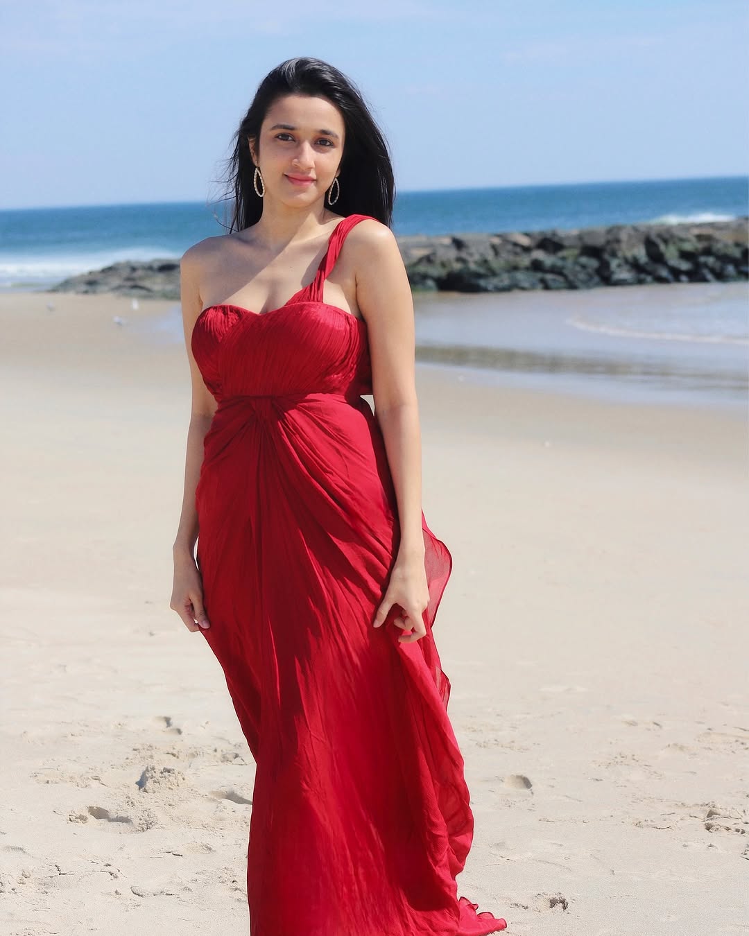 In a recent Instagram picture, Nuveksha looked radiant in a red gown. The dress had a fitted bodice and a flowing skirt. She posed by the beach with the wind playing with her hair. The caption was simple with a red heart emoji. She looks adorable in these pics.